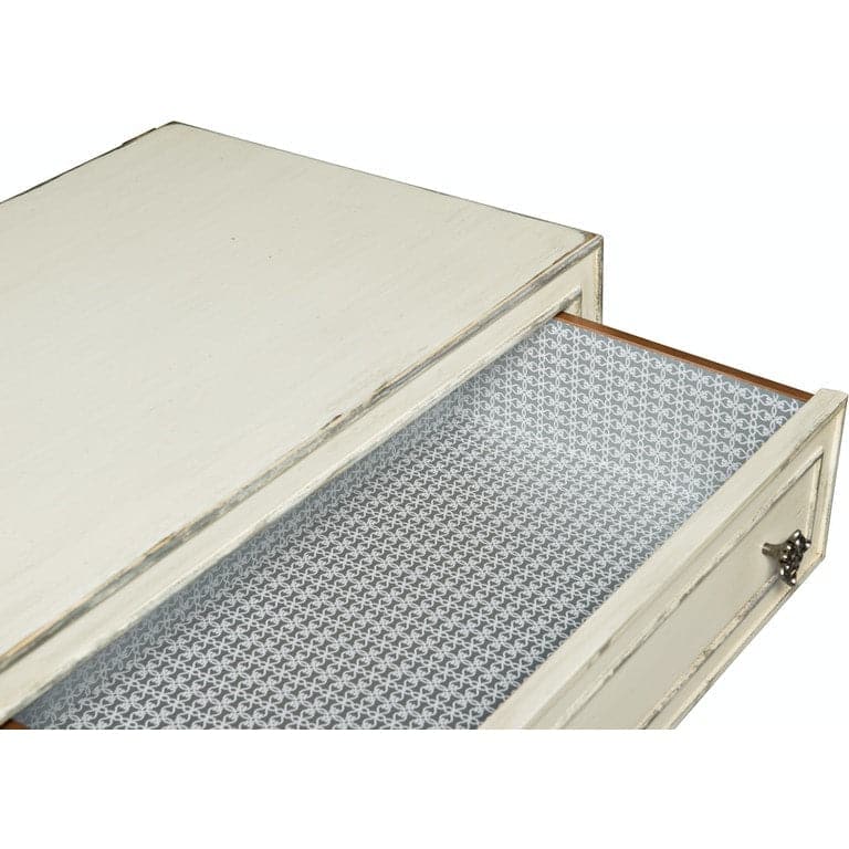 - Finish:Whites/Creams/Beiges,Blanc, a creamy white finish accented with champagne and silver tipping. Distressing includes rasping. Antique silver colored metal alloy custom decorative pull designed to look like a piece of jewelry.