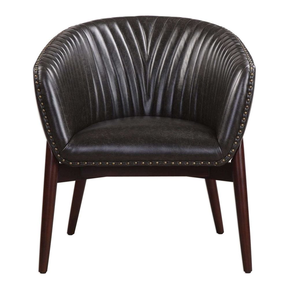 This High Style Design Features A Modernized Take On Scandinavian Style With "V" Shaped Channel-stitched Faux Leather, Distressed In A Casual Onyx With Contrasting Antiqued Brass Nail Head Trim. The Seat Rests In A Solid Oak Wood Frame Finished In A Smooth Walnut Stain. Seat Height Is 19".