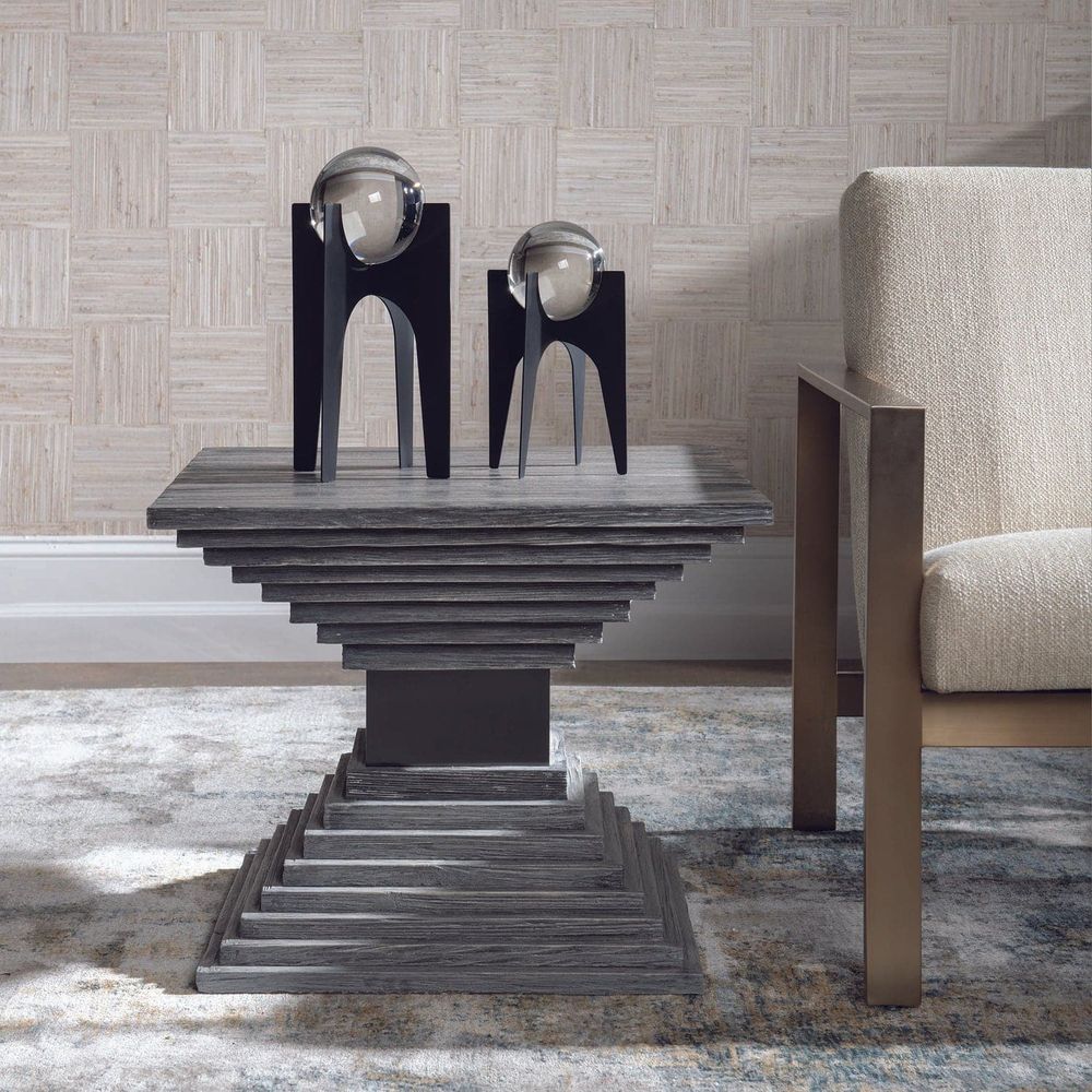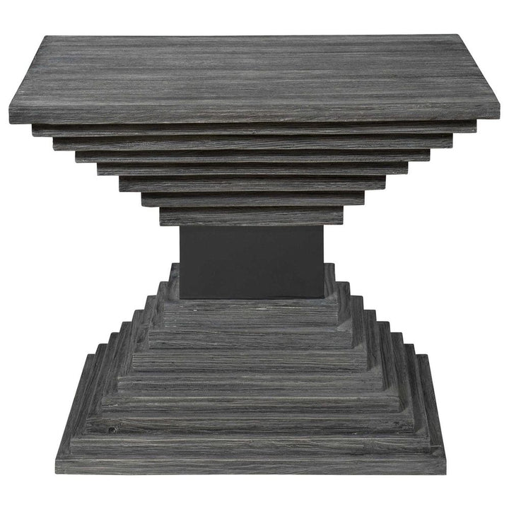 The Andes Accent Table displays a fun geometric construction from solid fir wood. The table is finished in a medium gray with wire brushed details and a light gray glaze, accented by a black nickel plated stainless steel center band. Group multiples together for a contemporary coffee table.