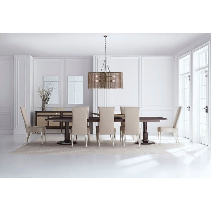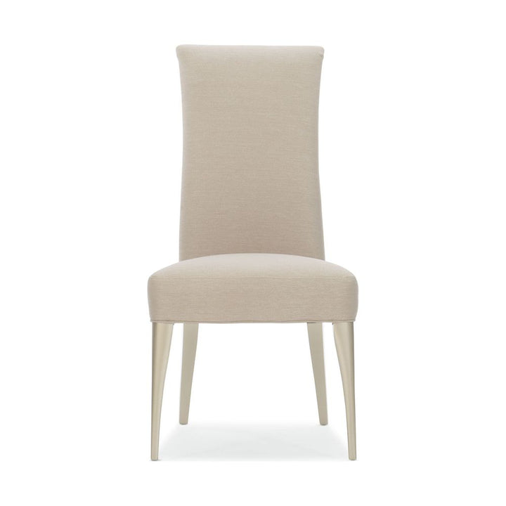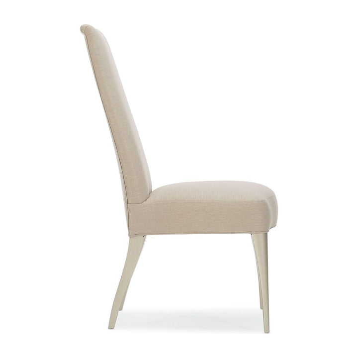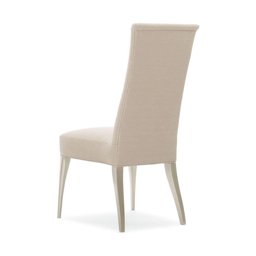 A true standout, the look of this bold dining chair will enchant everyone who sees it. Drawing inspiration from classic forms it features a tall, stately seat back that adds height and presence to any dining space. Fully upholstered and tailored to perfection, it also features tapered legs finished in a chic shade of Soft Silver Paint. This posh dining chair represents the perfect balance of style and substance.