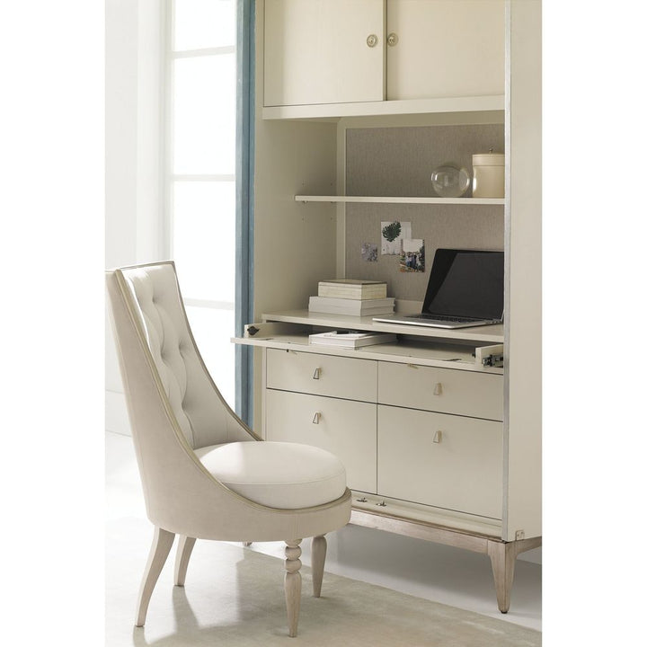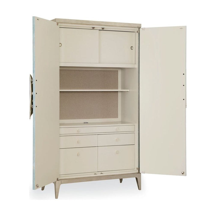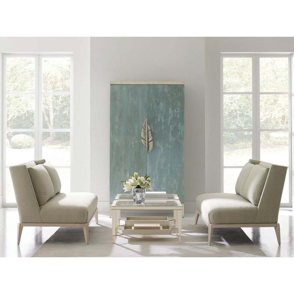 A piece of art is not always found on a canvas. Our custom-painted Watercolours cabinet is a piece of art that also solves a variety of functions in your home. Distinguished by its impressionistic Tranquil finish in greyish blue/aqua that has been kissed with silver leaf, it will literally shimmer in any room. In true style, our custom-designed, asymmetrical, metallic palm frond door pulls enhance this piece of art. Watercolours is sized to hold a 42-inch television. Additional features include a pull-out writing surface with cord access, two adjustable shelves behind sliding doors, as well as two drawers and two file drawers. Finished with a warm Coastal Silver Leaf plate cap and base, this piece functions as an office, entertainment center or bar with equal fluidity.