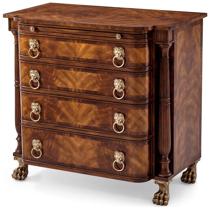 A mahogany and flame veneered bowfront chest of drawers, fitted with a brushing slide and four graduated rounded drawers fitted with lions mask drop handles flanked by reeded and bound column uprights on brass lions paw feet.Theodore Alexander is shaped by English Heritage handcrafts furniture and accessories for your home with uncompromising quality. They also believe that the person who owns a piece of Theodore Alexander Furniture should take comfort in knowing the item can be viewed from any side and they have made the piece by using a time-honored, handcrafted method that is the true mark of high quality. Every piece of Theodore Alexander has a story just waiting to be shared.