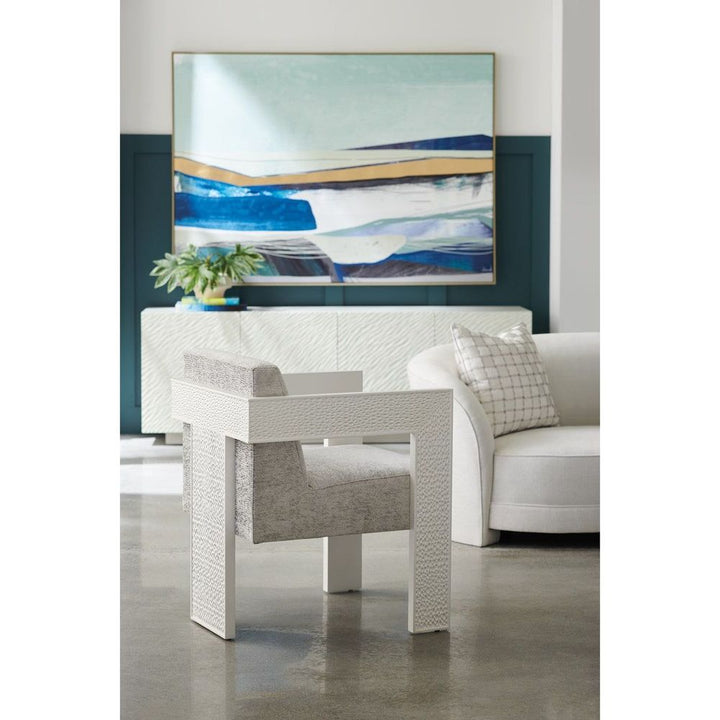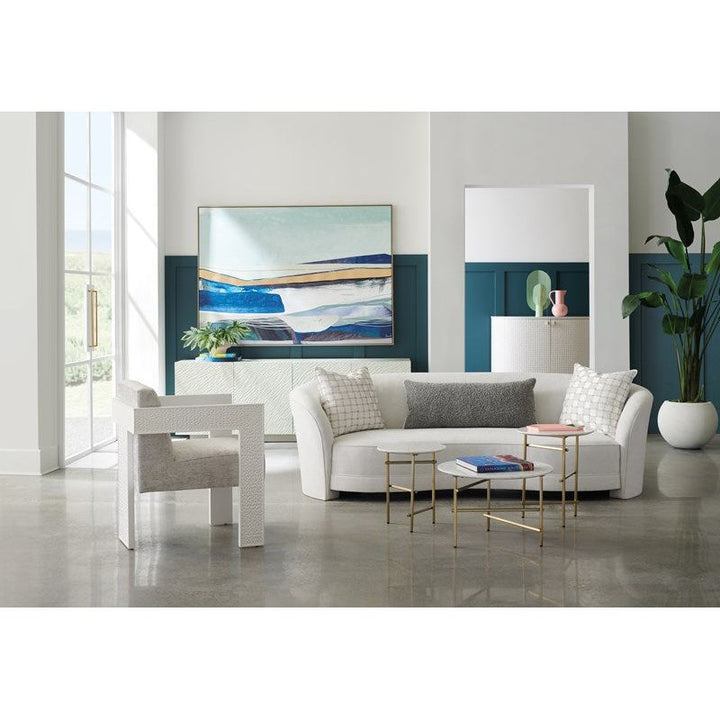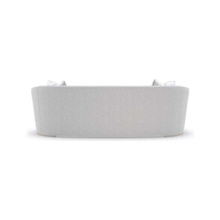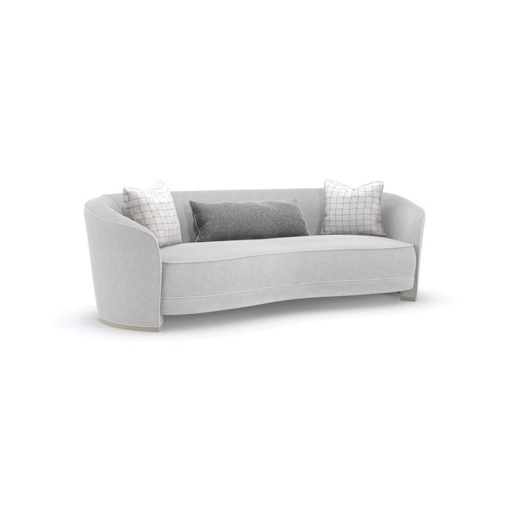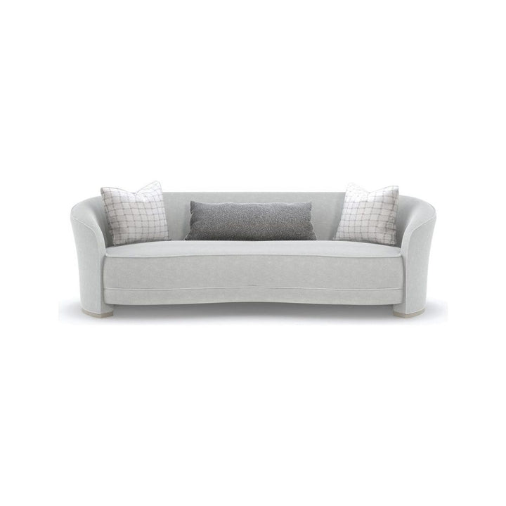 With an enveloping silhouette, this inviting sofa embodies comfort and easygoing elegance. Its subtly curved back and bowed bench seat are hand-tailored in a micro-chenille performance fabric, woven with metallic thread for a hint of shimmer. Delicate plinth legs lend balance and a sophisticated detail in a Matte Pearl finish. Woven satin checkerboard accent pillows and an extra-long lumbar pillow in a faux shearling create contrast and touchable texture.