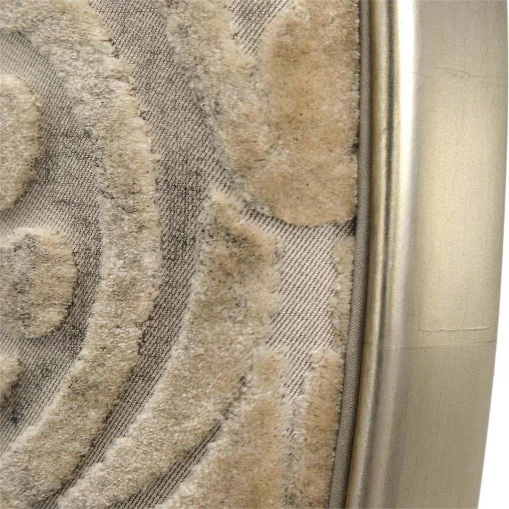 A contemporary dining side chair with an oval back is shown in a burnished silver finish and upholstered in a damask brown fabric.