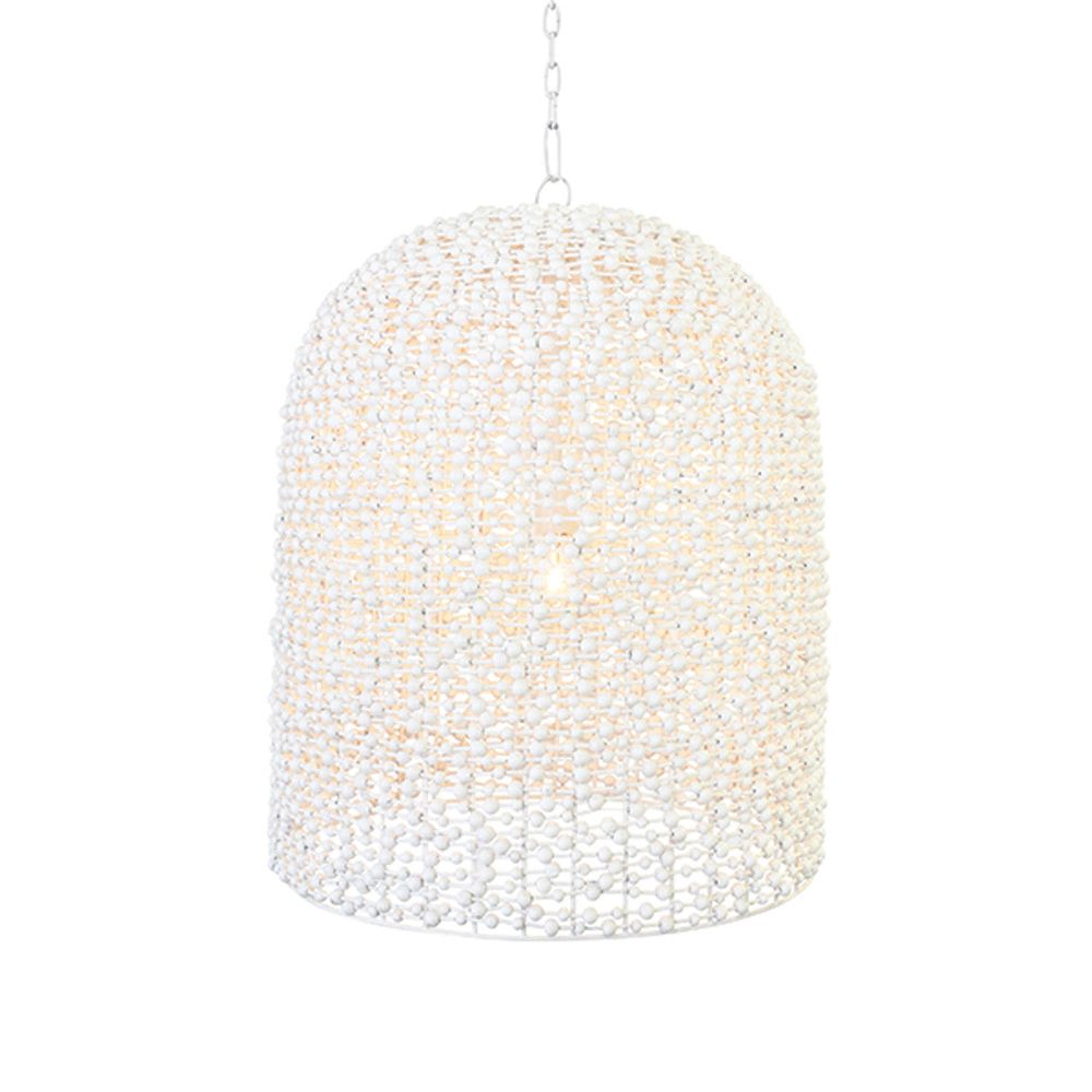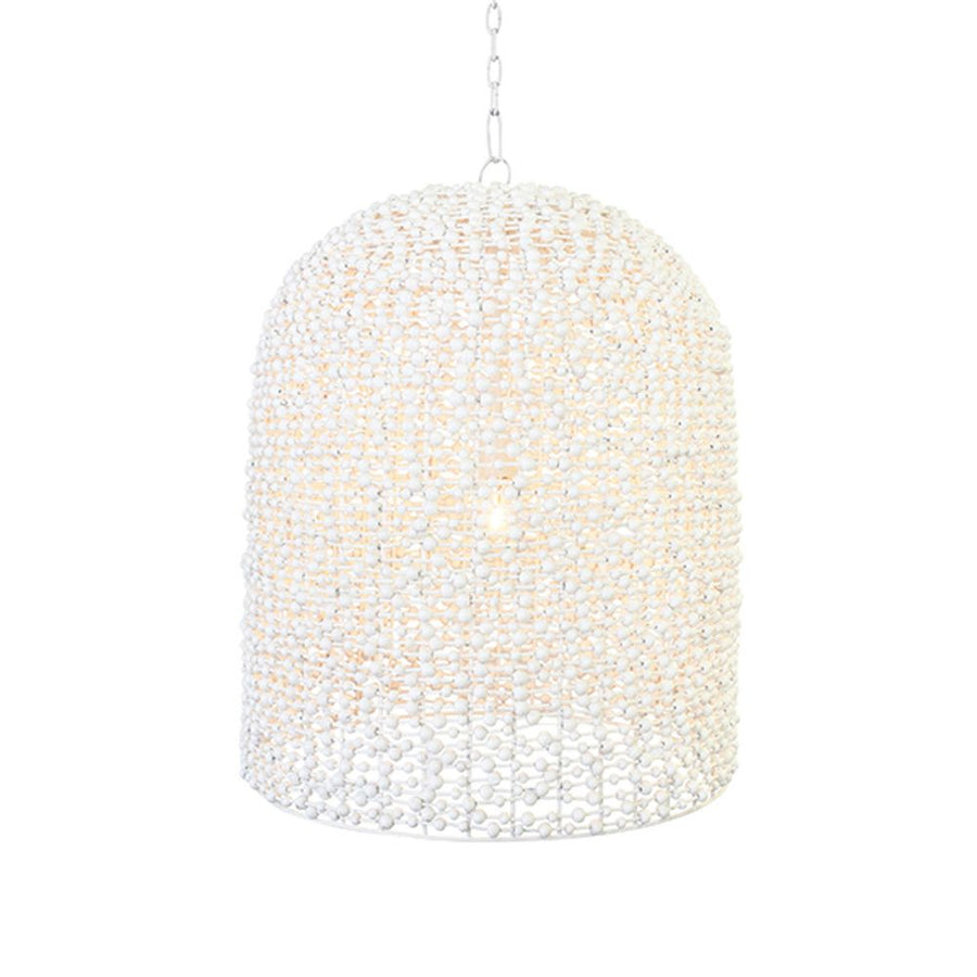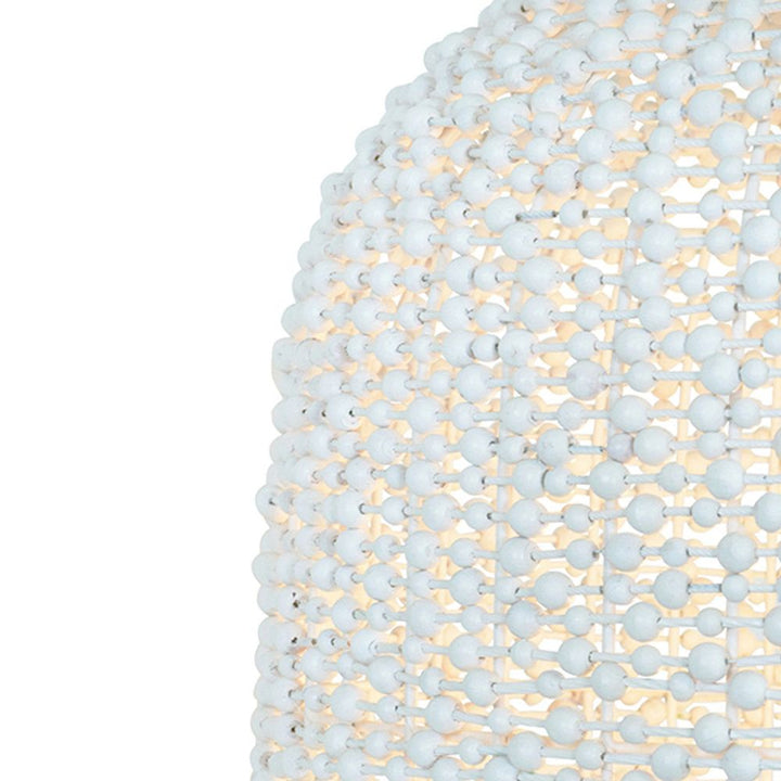 Description: ELONGATED DOME SHAPED PENDANT WRAPPED WITH WHITEWASH WOOD BEADS *Handcrafted and will carry slight variations piece to piece.