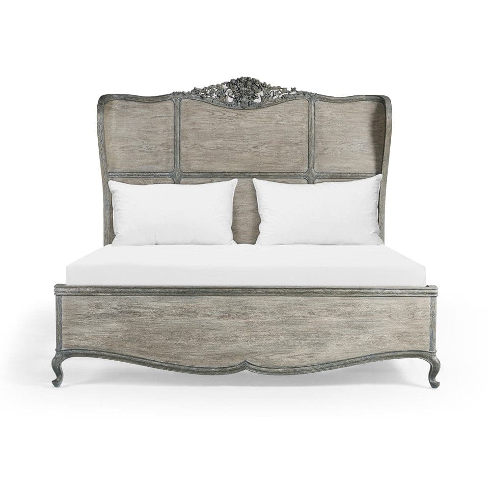 Wood bed with carved floral detail on headboard. Finished in Chipped Blue Oak.