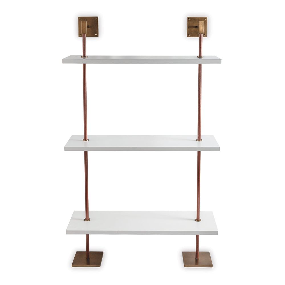 Modern multi-tier shelf in brown leather, aged brass and black! The shelf unit details urban simplicity with burnished finishes and faux leather connector poles with contrast vertical stitching. The poles/stitching may be turned to the front or the back if you choose to highlight or hide the contrast stitching.
