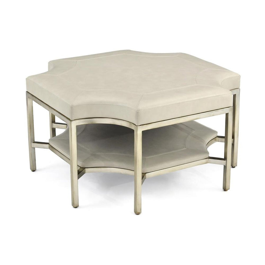 Description: This ottoman is an octagonal form comprised of straight and scalloped edges. The upholstered top and shelf are double-stitched in a soft-hand, light grey leather. The steel frame is finished in burnished silver.