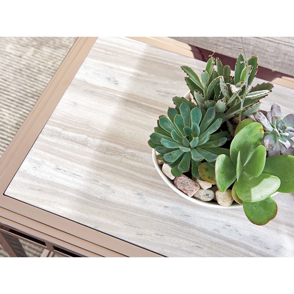 Feature 1: The architectural base is crafted from platinum-finished stainless steel, offering a rich silver patina. The floating top features a contemporary tiered design in stainless steel, framing a polished silver white marble top. Pair with the Athene End Table to create a chic and sophisticated look.