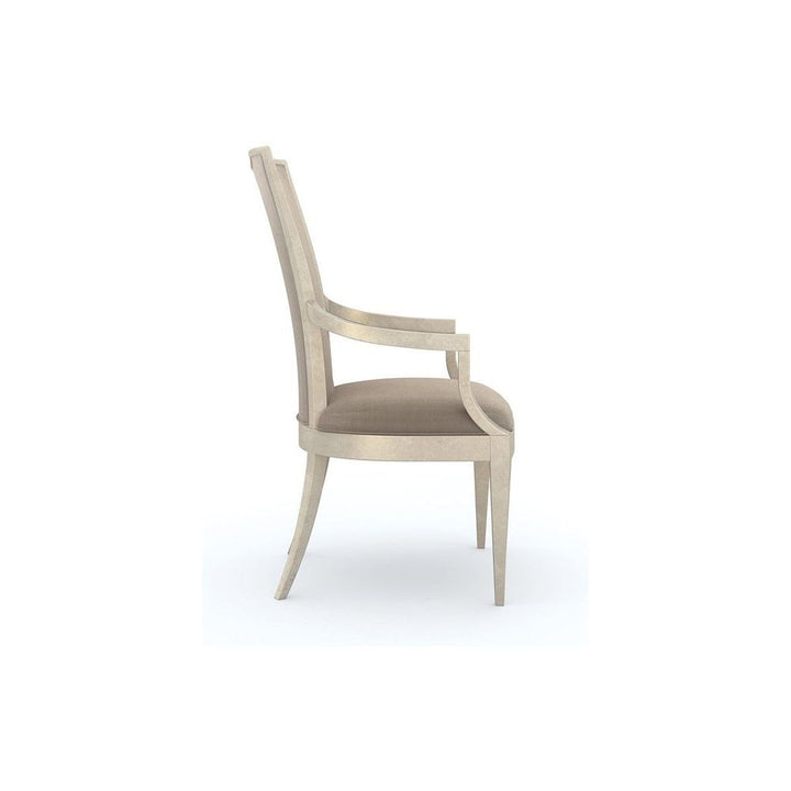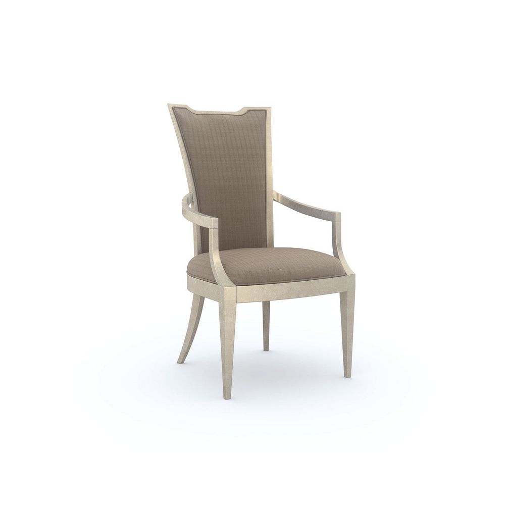Sit back and relax in style with this on-trend arm chair. Its striking silhouette is finished in Soft Silver Leaf and complements its upholstered seat, front and back. Designed for entertaining, it's as great for casual, everyday meals as it is for holidays and parties.