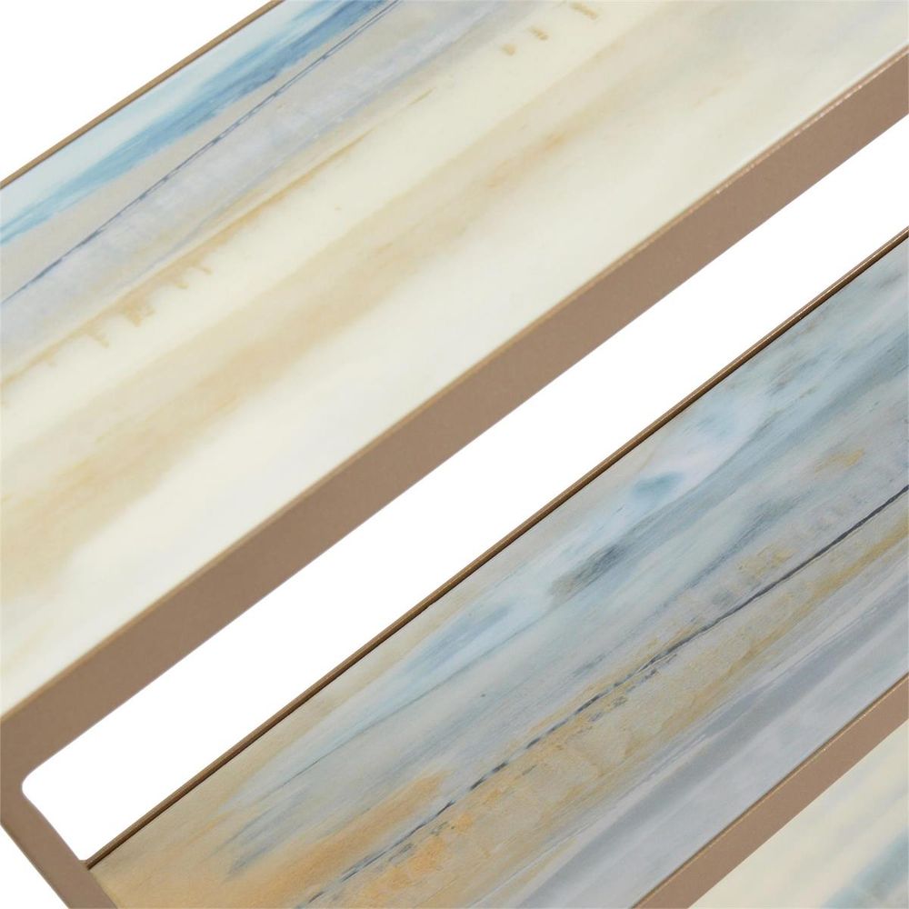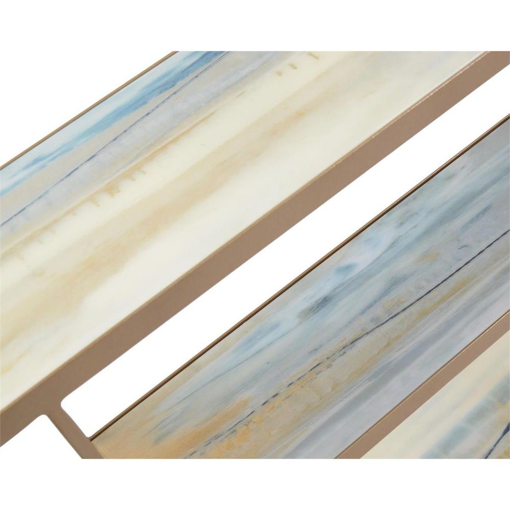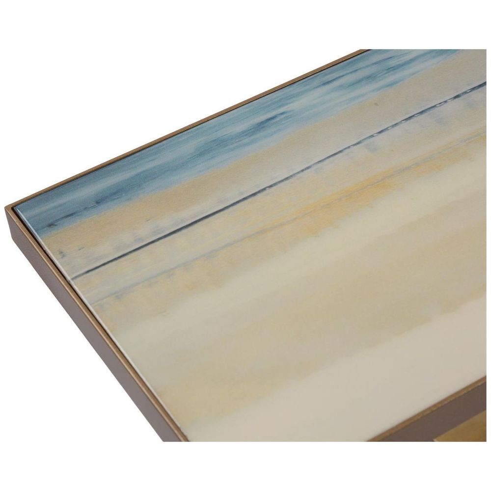 Description: The Concord image by artist Rowan A. James has been applied to the top and bottom tiers of this sofa table and covered in a hand-applied vitreous finish. The frame and legs are in a hand-finished gold.