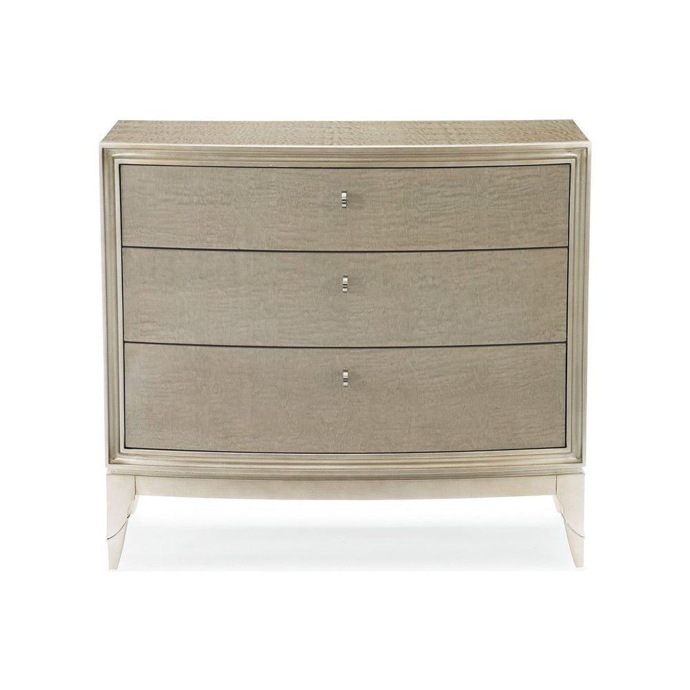 A classic form with updated style, this three-drawer piece adds distinctive glamour. Its perfect proportions are highlighted with a Moonlit Sand finish over Silver Curly Maple, and outlined in Soft Silver Leaf around its front frame and base. Refreshingly balanced, its tailored design is perfect for modern lifestyles.