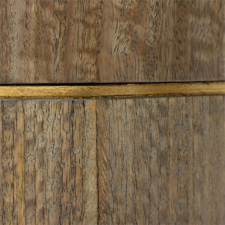 The Balanced Side Table is a tasteful accent piece that contributes a sense of depth and dimension within a space. Crafted from eucalyptus wood, the piece showcases gorgeous straight grain highlighted by a Tristan finish. A large, rounded cement base supports an overhanging tabletop. Tastefully subtle accent trim in Exotic Gold adorns at the neck of the piece, completing the look.