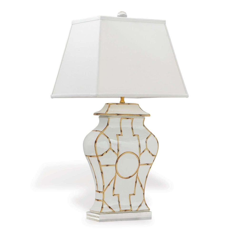 - Named in honor of famed decorator Billy Baldwin, and inspired by one of his favorite wallpapers by Scalamandre; the Baldwin white Lamp is hand painted porcelain with embellishments of solid brass hardware and a lucite stand. Crystal ball finial. 3 way switch. 150 watt max bulb.