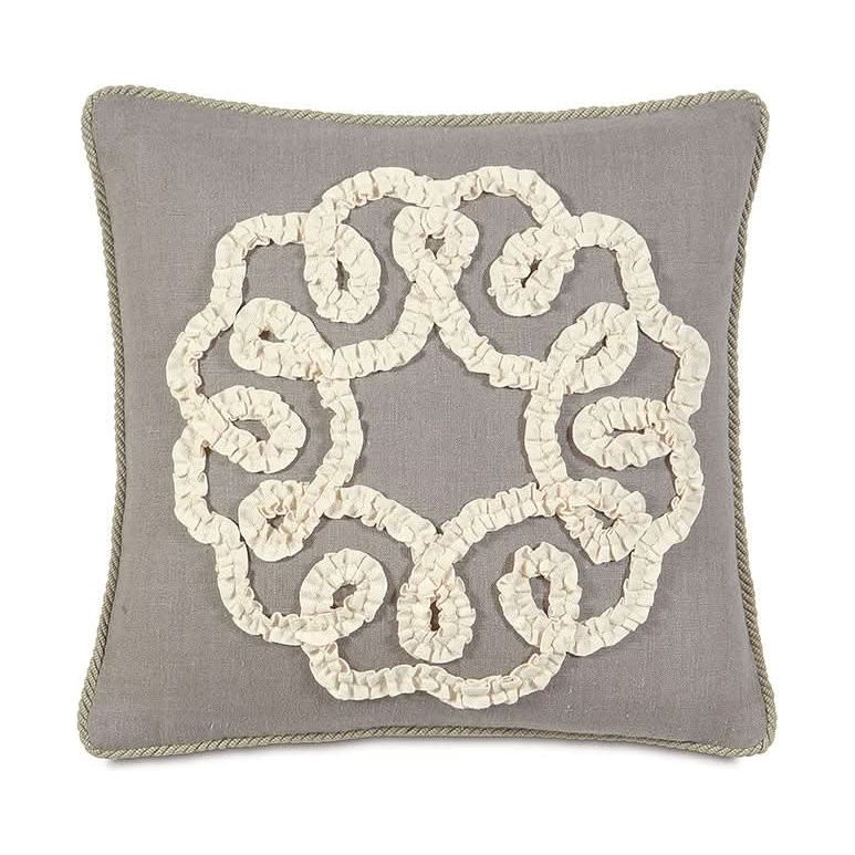 - Ruffled white ribbon forming a flower design over a 100% linen fabric face