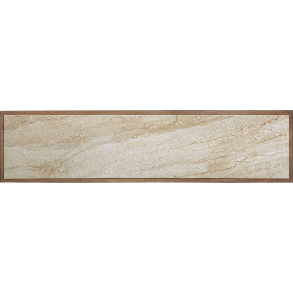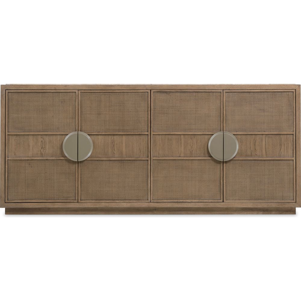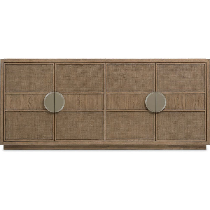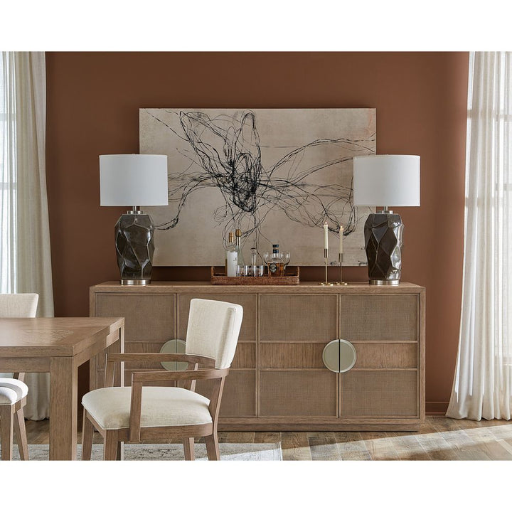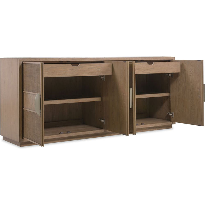 Description: Blending organic textures and neutral tones with a refined minimalist silhouette, the stylistically versatile Ballad Dining Credenza exudes a natural luxury. The four cane-front doors are soft close with magnetic catches, and the left pair of doors has one drawer with a removable cream-colored felt silverware tray. The right pair of doors has one drawer with a drop-in felt liner. There's one adjustable/reversible wood shelf with wine storage option that holds up to 9 bottles in each pair of doors. The marble inset top combines cream, beige and brown colorations. The frame is crafted of Quartered and Cathedral-Cut White Oak Veneers in a light earthen-toned finish. Satin-finished large semi-circle pulls add a swanky accent.
