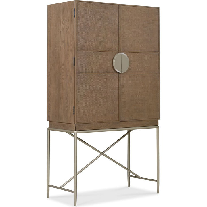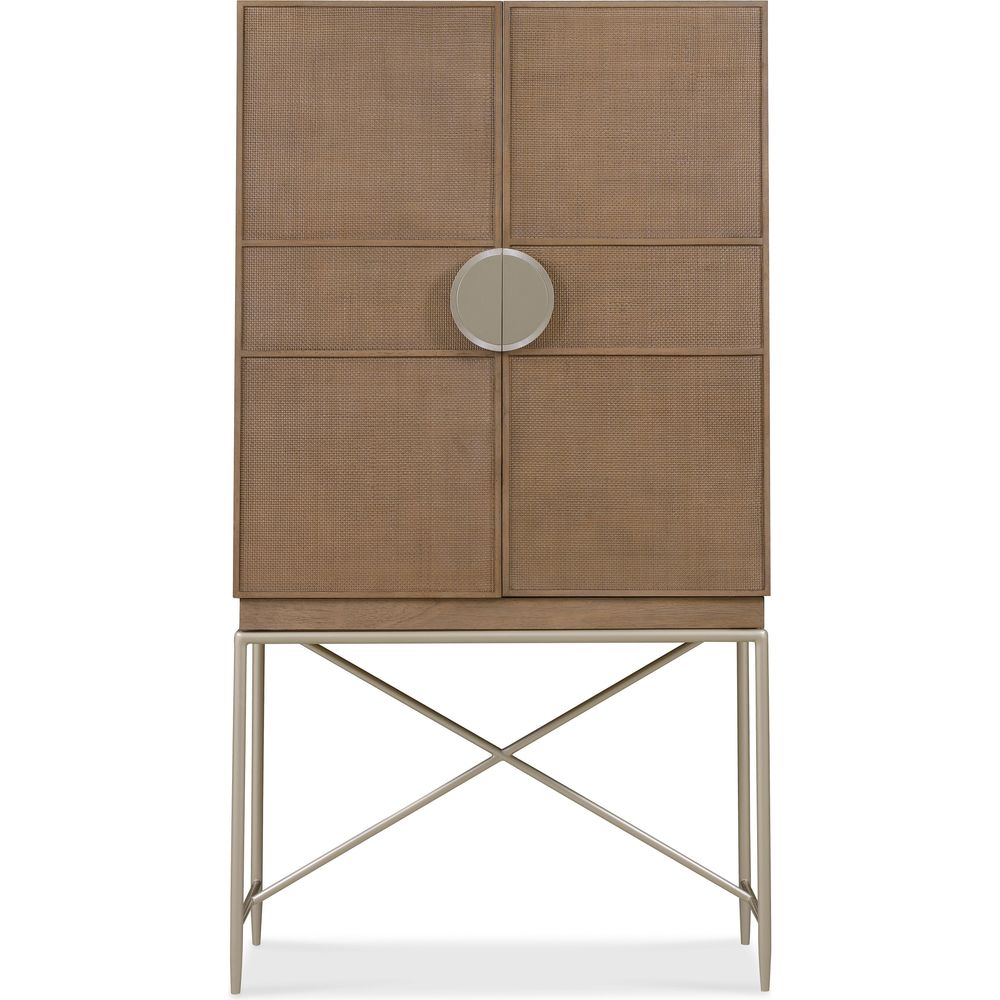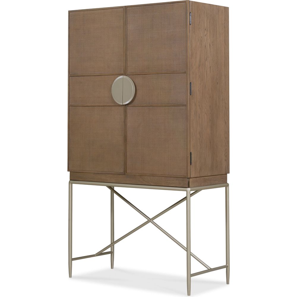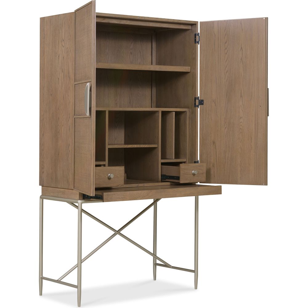 Description: The Ballad Hub offers a stylistically versatile, highly functional piece that blends natural textures with a refined minimalist silhouette. Crafted of Quartered and Cathedral-Cut White Oak Veneers in a light earthen finish with complementary woven cane door fronts, the Hub gets you organized and keeps clutter out of sight. Behind the two doors with soft-close hinges are an adjustable shelf in the top section; one fixed wood shelf; four small vertical storage cubbies with two removable partitions on magic wire; one adjustable wood shelf in the center section, two small drawers and a metal base with slender tapered legs and a stretcher. A circle-shaped pull and round knobs on the inside in a champagne finish enhance the chic vibe. Measures 40 inches wide by 20 inches deep.