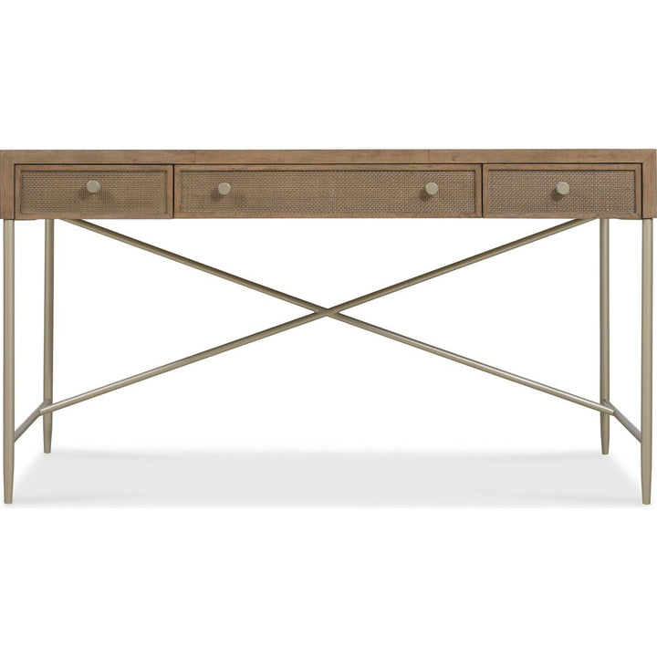Features: Three drawers; Writing insert and pencil tray can be used in either left or right top drawer; Each of the top drawers has two removable partitions; Center drawer with drop-front writing surface and wire management; Metal base, stretcher and tapered legs; Cane front drawer fronts and visitor side
