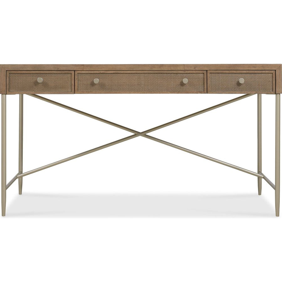 Description: An ideal writing desk for any space - loft, bedroom, kitchen, living area - the Ballad Writing Desk offers a stylistically versatile, functional piece blending natural textures with a refined minimalist silhouette. Crafted of Quartered and Cathedral-Cut White Oak Veneers in a light earthen finish with complementary woven cane drawer fronts and outer surface, it has a metal base, stretcher and tapered, slender legs. Featuring three drawers, it has a writing insert and pencil tray that can be used in either the left or right top drawer. Each of the top drawers has two removable partitions. The center drawer has a drop-front writing surface and wire management. Measures 58 inches wide by 28 inches deep.
