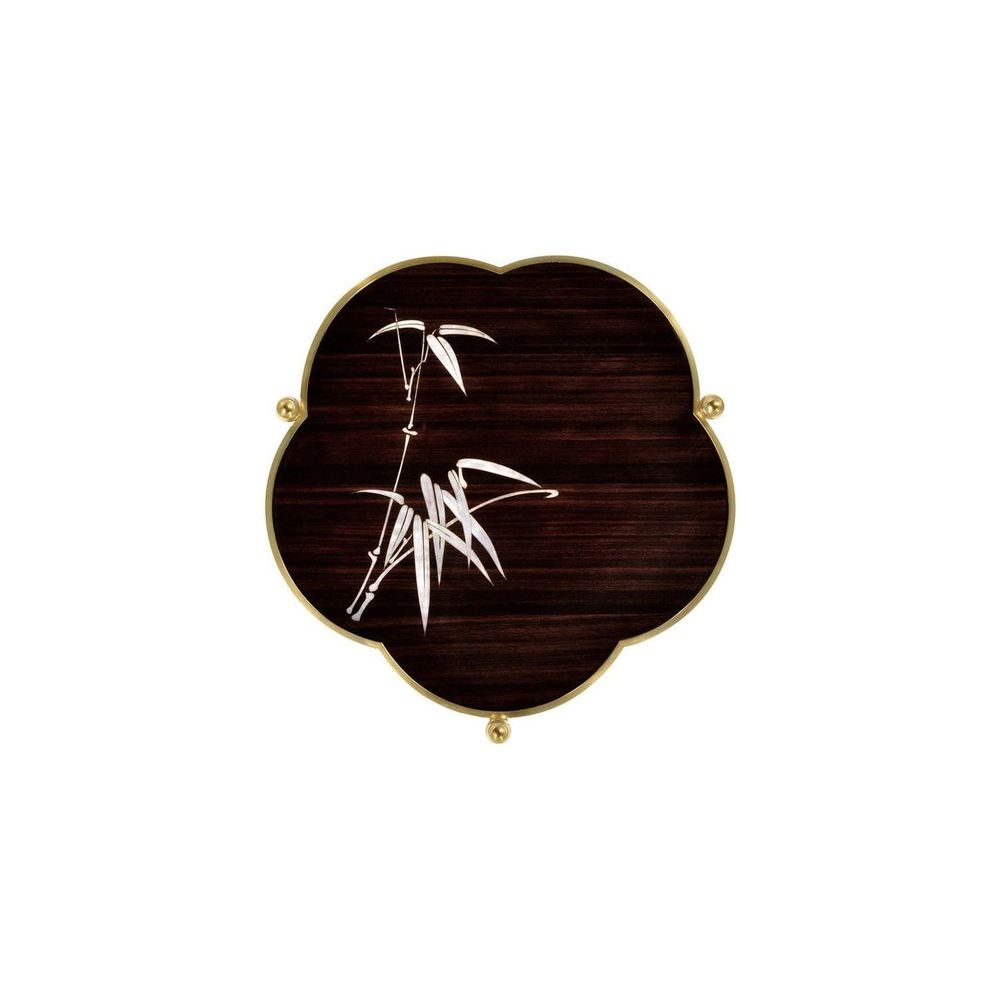 Three-tier end table in macassar ebony and antique brass detailing and base. The legs designed to represent bamboo and a beautiful painted white flower design on the top tier.