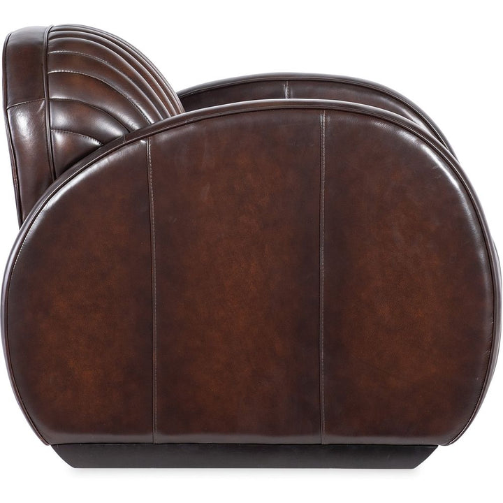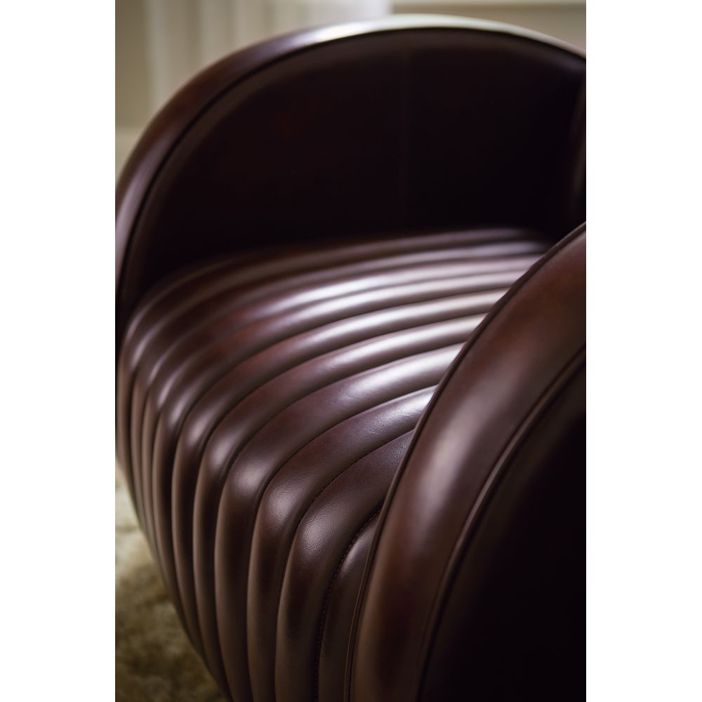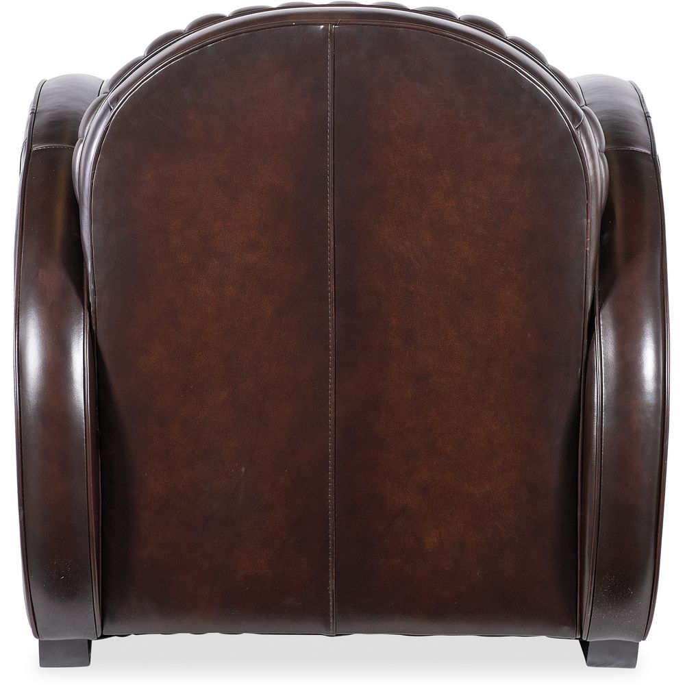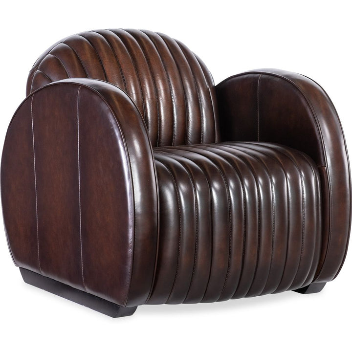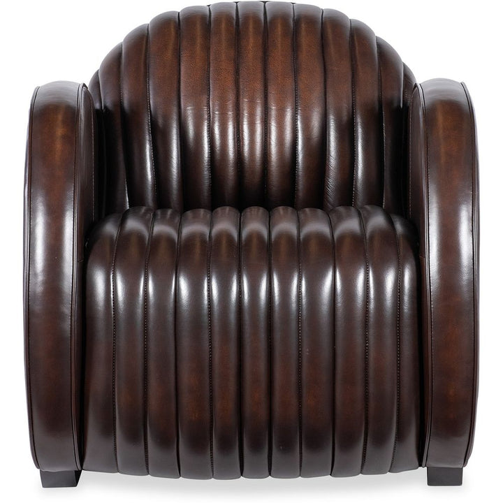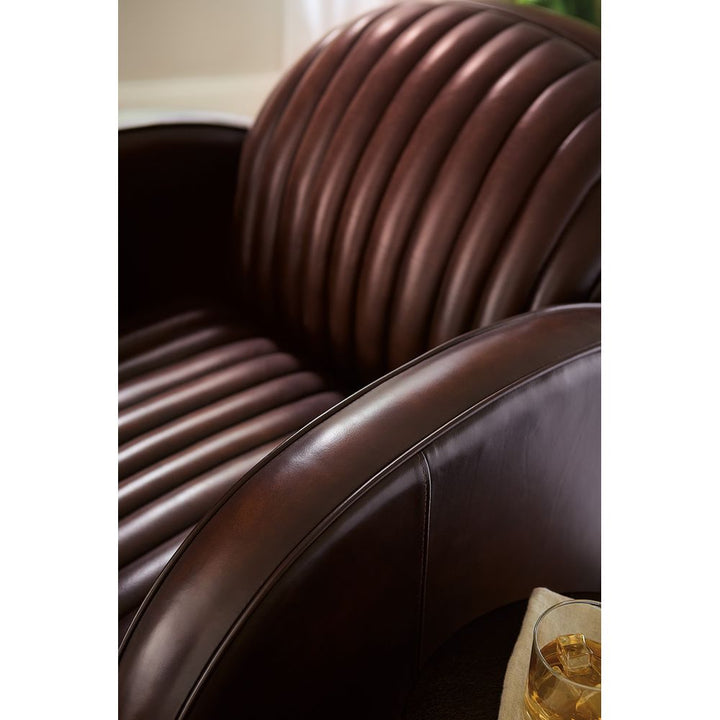 Description: In a bold modern design with an Art Deco flair, the Banks Chair has a plush channeled back and seat and rounded track arm style with wood sled feet. Welt and topstitch trim adds an upscale feel, along with the Vortex semi-aniline top grain leather.