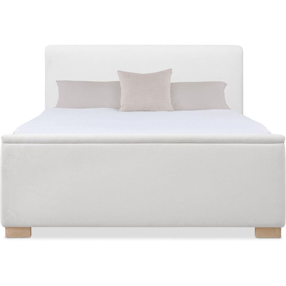 Upholstered Bed: Elevate your bedroom with the Banyon Bay Upholstered Bed. Featuring a fully upholstered, padded design and wood block feet, this bed combines clean, contemporary lines with natural textures, making it a perfect fit for modern, casual lifestyles. Crafted from white oak solids and oak veneers, the light Desert Oak finish is enhanced by wire-brushing and cerusing for added texture. The headboard, footboard, and rails come together to create a cohesive, stylish look that complements any interior design. Developed with an eclectic mindset, Banyon Bay is youthful and cool, combining precise geometry and gentle contours with natural textures and materials. Delivering smooth contemporary lines, this modern collection is a perfect fit for a casual lifestyle, moving effortlessly between urban, coastal, and mountain settings. Modestly scaled, this collection features white oak veneers and solids in a light Desert Oak finish, accented with an authentic mix of organic materials, creating a cohesive, casual look.