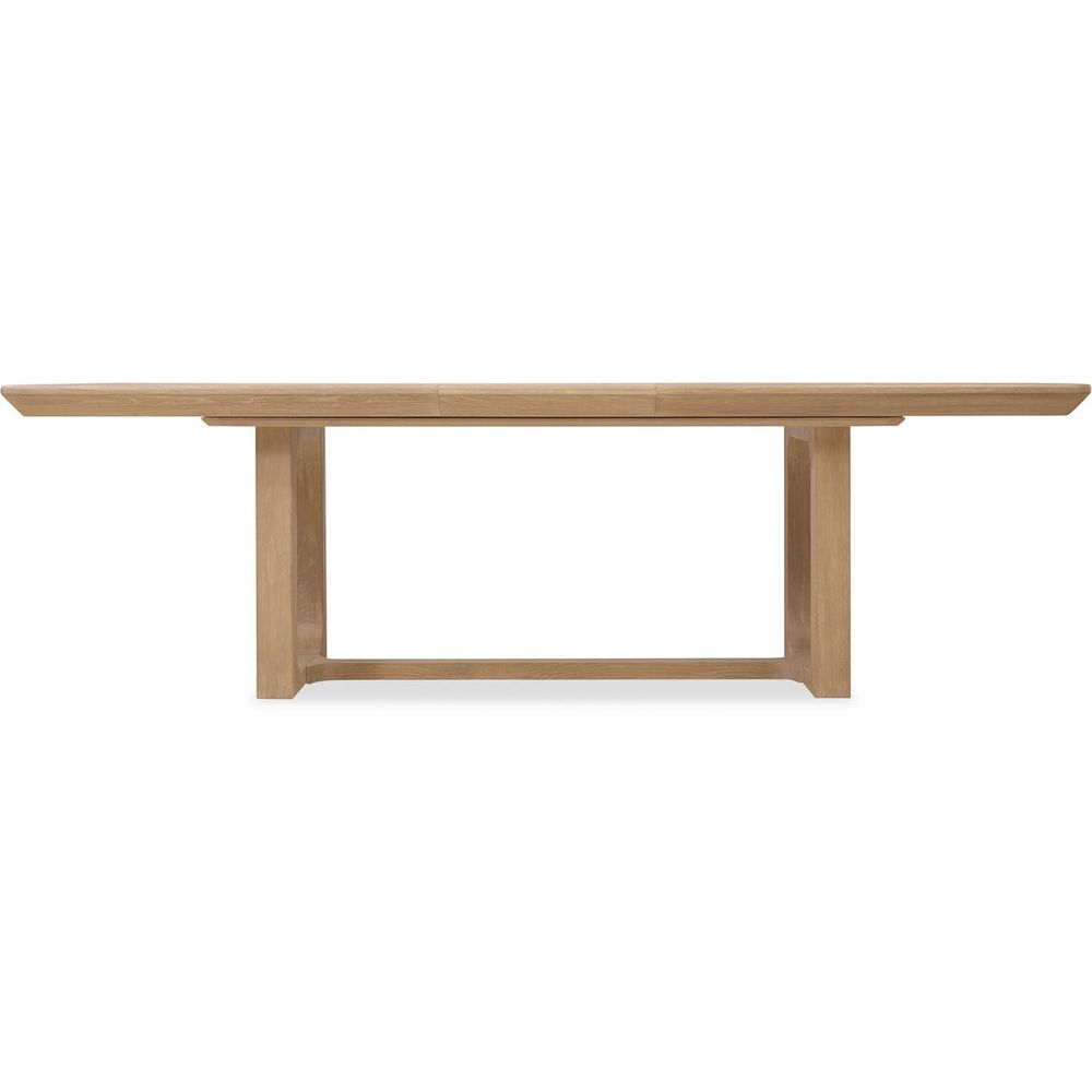 Rectangle: The Banyon Bay Rectangle Dining Table features a versatile design perfect for both small and large gatherings. It includes two 20-inch leaves, extending the table to 121 inches in length. Crafted from white oak solids and veneers in a Desert Oak finish, this modern table boasts double open pedestals and a stretcher for both stability and aesthetic appeal. The multi-step finishing process, which includes wire-brushing and cerusing, provides a rich texture that enhances its contemporary look. Ideal for casual or formal dining, this table is a great addition to urban, coastal, or mountain settings. Developed with an eclectic mindset, Banyon Bay is youthful and cool, combining precise geometry and gentle contours with natural textures and materials. Delivering smooth contemporary lines, this modern collection is a perfect fit for a casual lifestyle, moving effortlessly between urban, coastal, and mountain settings. Modestly scaled, this collection features white oak veneers and solids in a light Desert Oak finish, accented with an authentic mix of organic materials, creating a cohesive, casual look.