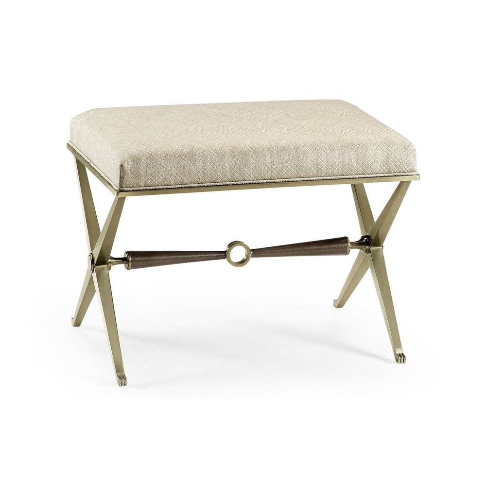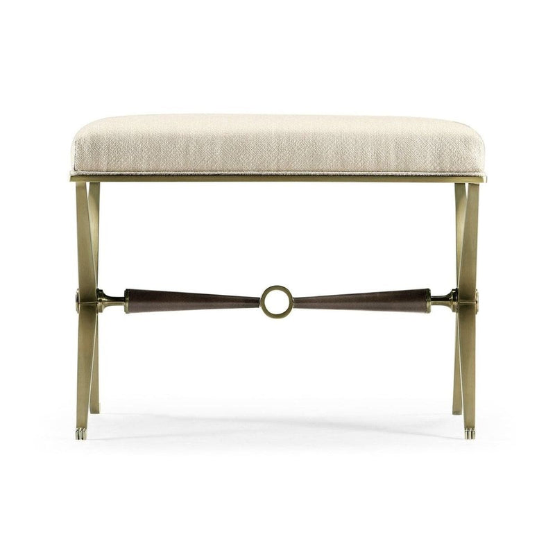 Inspired by traditional Spanish iron work, the base is fabricated from steel and finished in a light, champagne patina. Seat is covered in a Jonathan Charles performance fabric.
