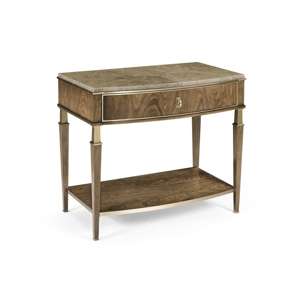 Top features figured Spanish marble. Drawer fronts feature walnut swirl veneer with a transparent, low luster finish. Hardware is cast in our foundry and finished in a light champagne patina.