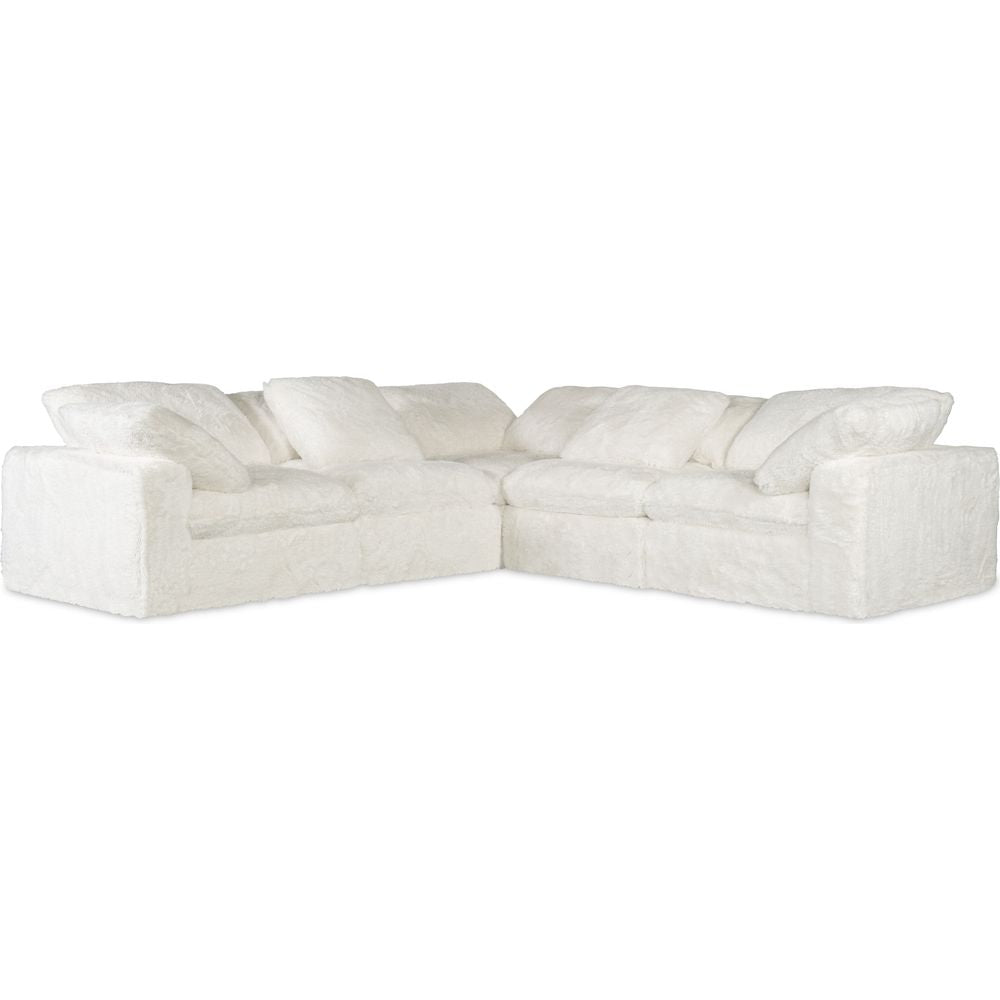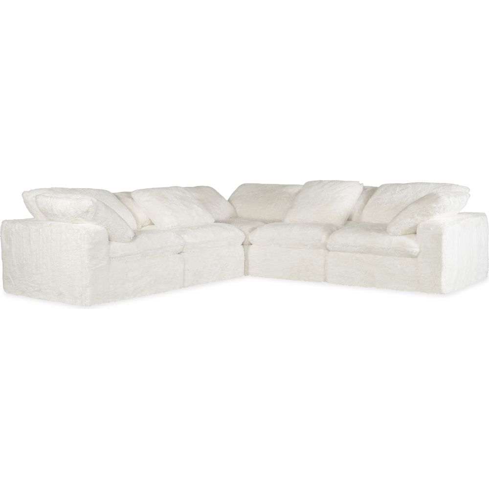 Description: Wrap yourself in cozy with the Barefoot 5-seat comfort sectional, covered in the Yakety Yak natural-colored plush super-soft fabric. Consisting of 3 corner/arm components and two armless components with a loose pillow at each arm, the generously-scaled L-shaped sectional measures 125 inches wide by 125 inches deep.