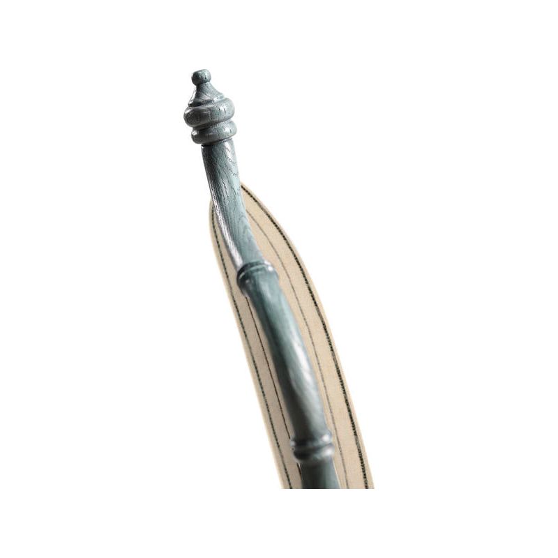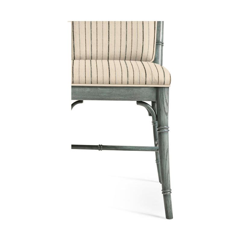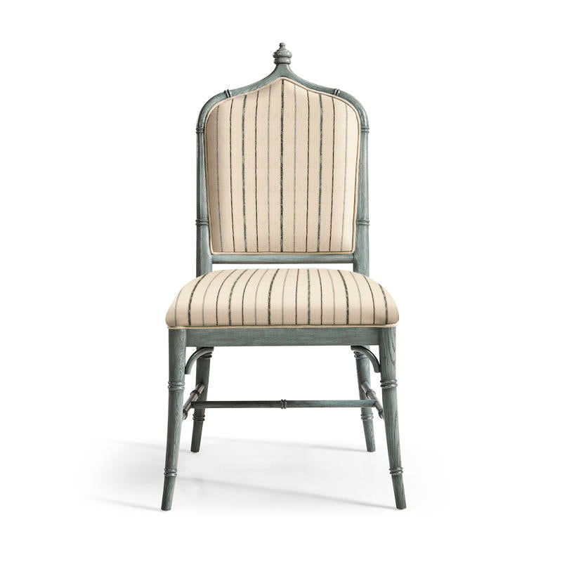 Description: The Baronial Side Chair is a delightful fusion of whimsy and casual. Crafted with a solid wood frame and finished in a charming faded blue oak, it exudes character and sophistication. The chair features striped fabric upholstery that adds a playful touch while maintaining a refined look. With its whimsical design and sturdy craftsmanship, the Baronial Side Chair brings both style and comfort to dining rooms, living spaces, or any corner of your home in need of a statement piece.