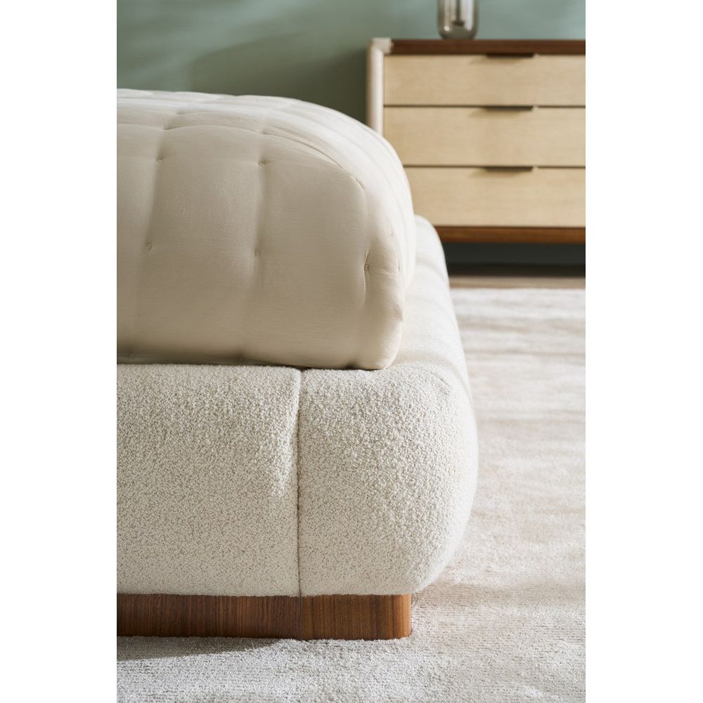 Postmodern design is displayed in this sophisticated dresser that exudes a creative mix of materials. This eclectic, rectangular piece is softened with bullnose edges around. The top, base and rounded plank legs are dark Retro Walnut. The fronts of the six, generous drawers showcase the tiny, swirling eyes of Birdseye Maple with a light, smoked finish. Stone-colored micro-suede dresses each end of the chest. Thin beads of Brushed Gold metal are embedded in the Walnut. Insides of the drawers are finished in UV Linen. Dramatic bullnose-curved pulls in Brushed Gold metal are fully integrated into each drawer and wrap the entire drawer's front.