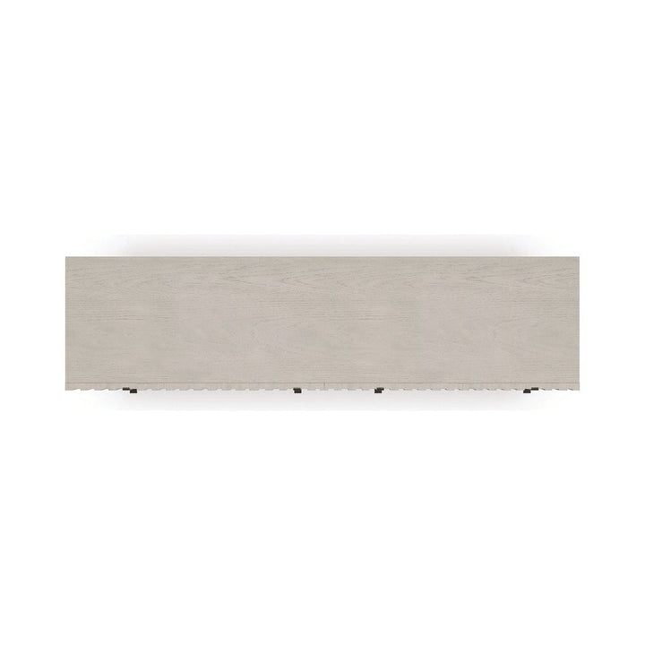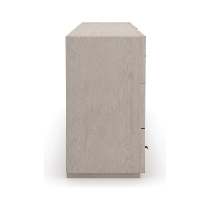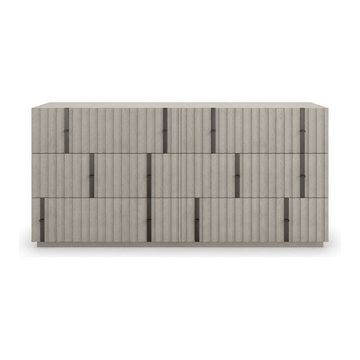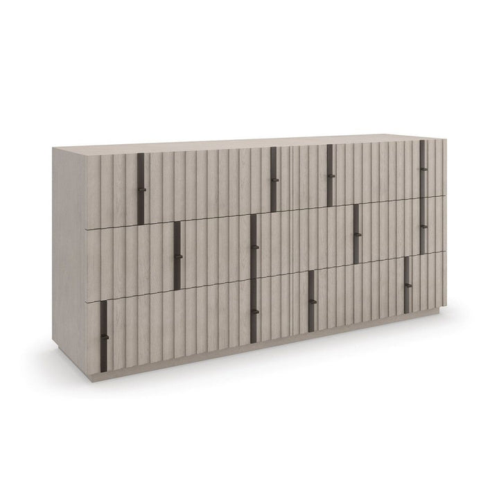 A harmonious mix of wood and metal, the Clancy dresser introduces an architectural element with layers of visual texture. Slatted details create depth and dimension, punctuated by open-grain oak in a neutral taupe finish. Features six spacious drawers with minimal pull panels in matte black metal.