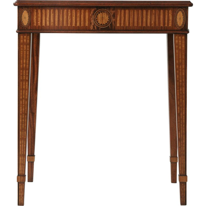 A finely flame mahogany, Morado banded and sycamore veneered lamp table with fine double stringing, the serpentine top above a fluted veneered frieze with fan inlaid details and a concealed frieze drawers, on square tapering legs with fluted inlay.Theodore Alexander is shaped by English Heritage handcrafts furniture and accessories for your home with uncompromising quality. They also believe that the person who owns a piece of Theodore Alexander Furniture should take comfort in knowing the item can be viewed from any side and they have made the piece by using a time-honored, handcrafted method that is the true mark of high quality. Every piece of Theodore Alexander has a story just waiting to be shared.