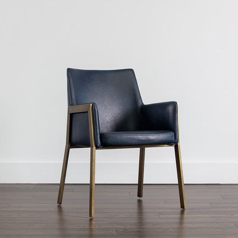 This dining armchair features a shapely design with an exposed brushed antique brass frame. Available in bravo admiral, black, cognac and kendall grey faux leather. Handle With Care: This design has been crafted with faux leather. Faux leather is manufactured to reflect the natural characteristics of leather; as such, colour variations, markings wrinkles, grooves, and light scratches are appreciated characteristics. No two pieces will be alike. Visit our Product Care page for more information on how to ensure the lasting beauty of this piece.