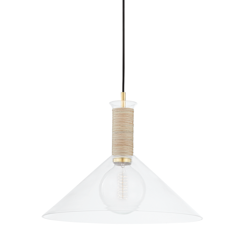 A cone-shaped shade in clean, clear glass lets brilliant, bright light shine through. The elongated neck is wrapped in raffia and the cord is made of black cloth, giving the piece little "kisses" of natural design. This pretty pendant looks casual yet feels sophisticated, making it a perfect choice for many interior styles.