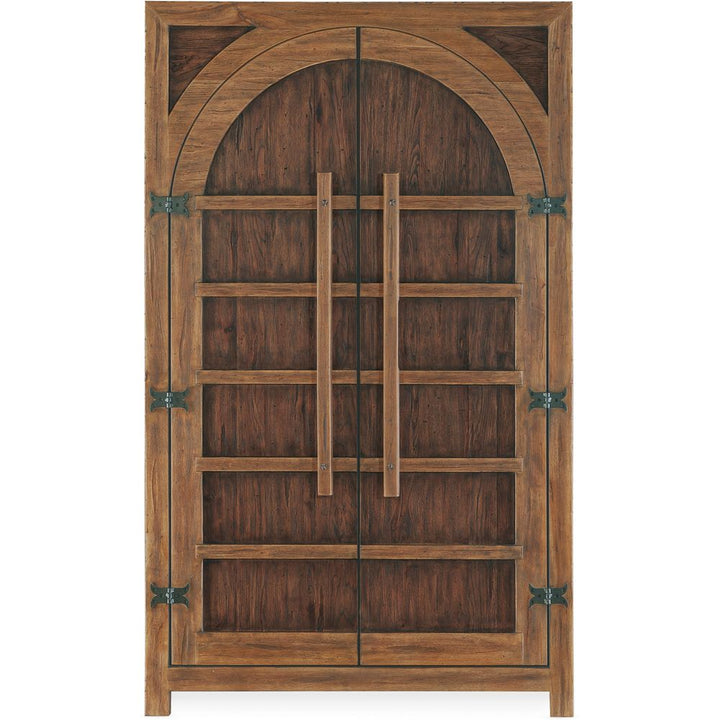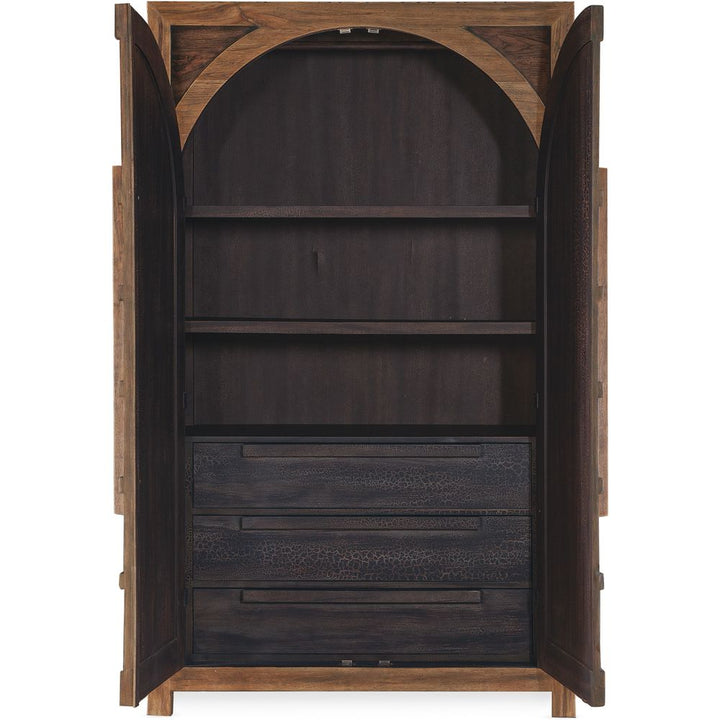 Inspired by the grandeur of wide open spaces in the American wilderness, the Big Sky Wardrobe exudes warmth with its rustic Pecky Hickory Veneers and Vintage Natural finish. The sweeping arched panel at the top of the case, authentic door hinges and wood bar hardware take you back to the heritage of post and beam construction and true craftsmanship.