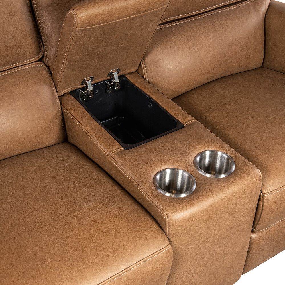 Description: Bring the vibe of a Southwestern ranch into your home with the Bishop Power Reclining Loveseat with Power Headrests. Featuring a zero-gravity reclining option on both sides that makes you feel weightless and removes all pressure points from your body, the loveseat has a bustle-back style, padded arm design and is covered in a Nubuck Top Grain Denver Coffee Leather. Two metal cupholders and a lift-top console with storage area inside is featured in the middle of the loveseat, and a convenient USB port is also included.
