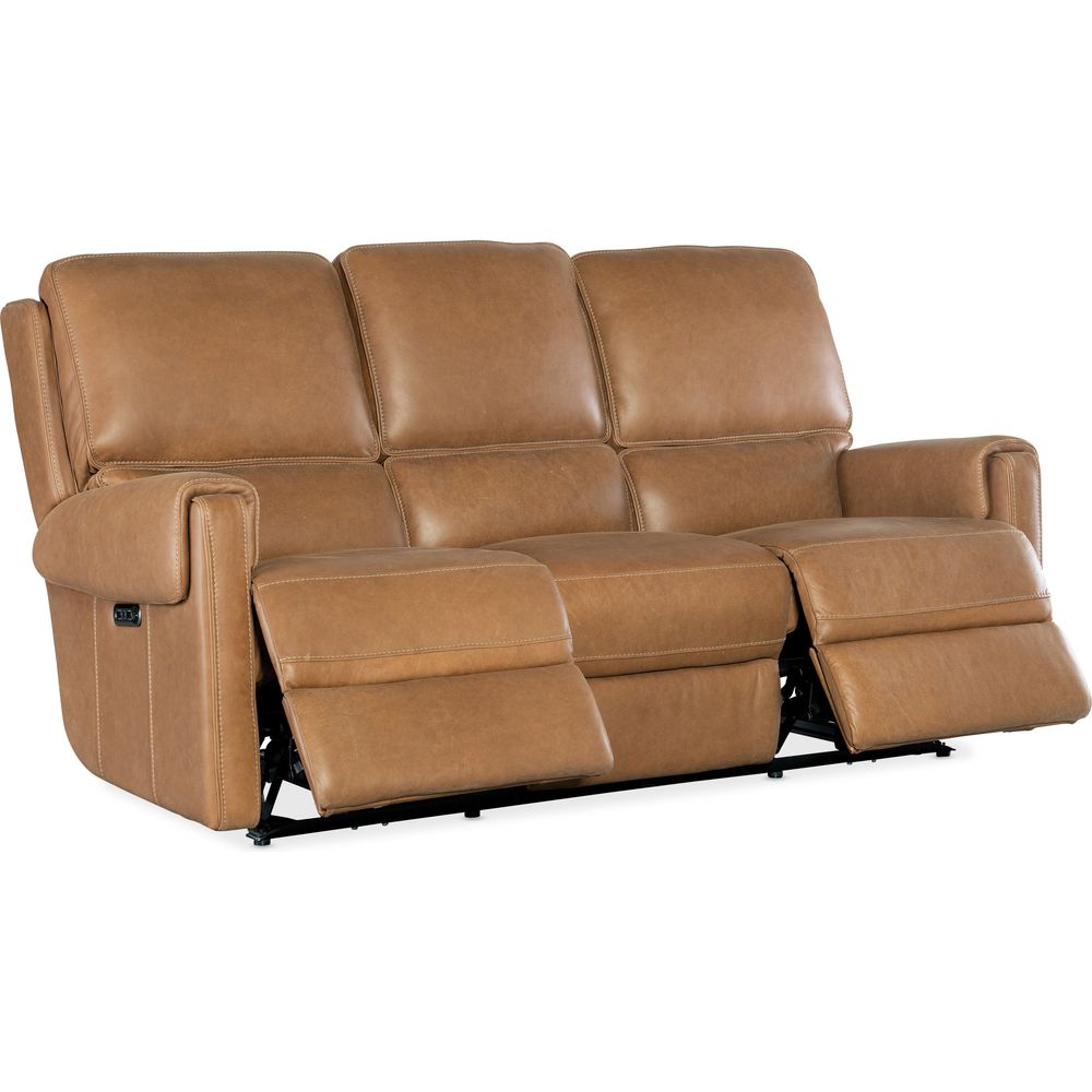 Description: Bring the vibe of a Southwestern ranch into your home with the Bishop Power Reclining Sofa with Power Headrests. Featuring a zero-gravity reclining option on both ends that makes you feel weightless and removes all pressure points from your body, the sofa has a bustle-back style, padded arm design and is covered in a Nubuck Top Grain Denver Coffee Leather. A convenient USB port is also included.