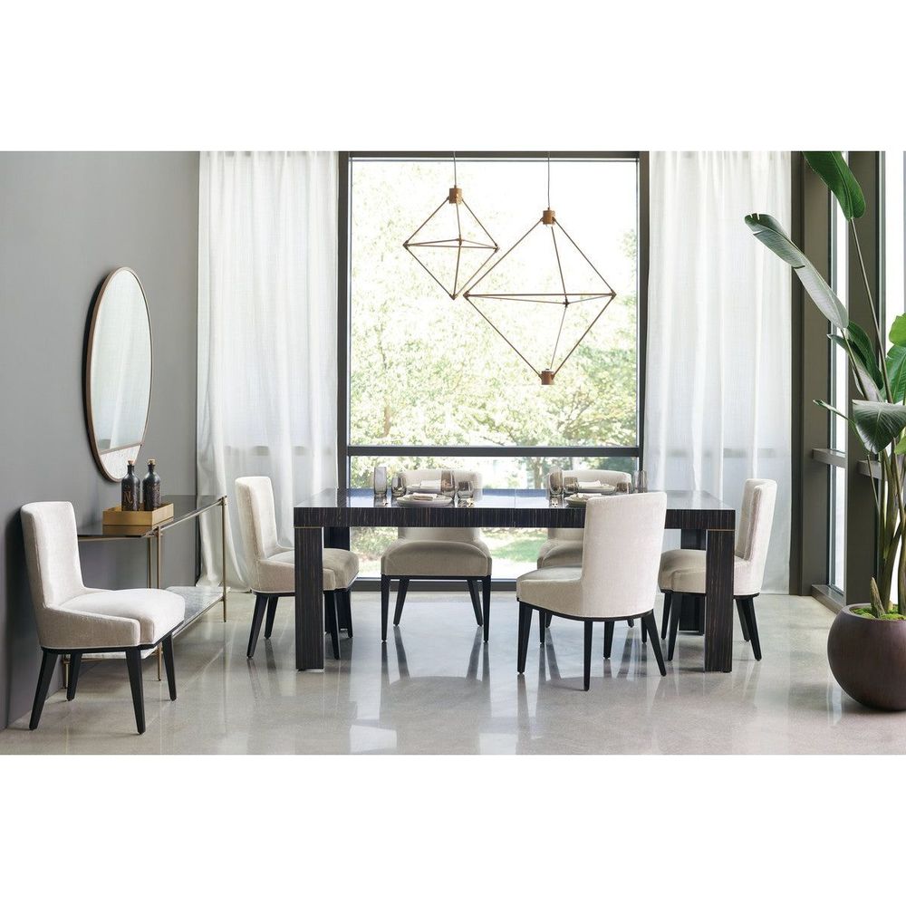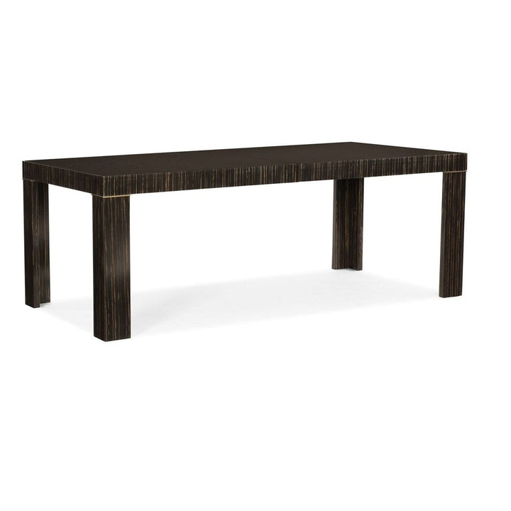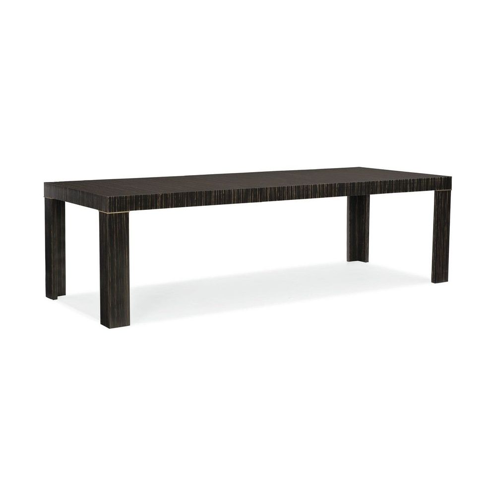 Treat yourself to an exceptional dining experience at every meal by incorporating this stunning dining table into your design plan. Its clean, simple lines reflect the timeless form of a parson table reinterpreted with a fresh mix of materials. Engineered ebony finished in Striated Ebony with Lucent Bronze Metallic paint trim adds bold character to the table top and legs without taking away from its streamlined form. The epitome of everyday elegance, this dining table's generous 80-inch width is designed for entertaining and can be extended to 102 inches with the addition of its 22-inch leaf making holidays more fun and ensuring everyone always has a place at the table.