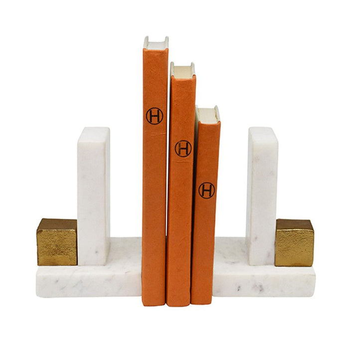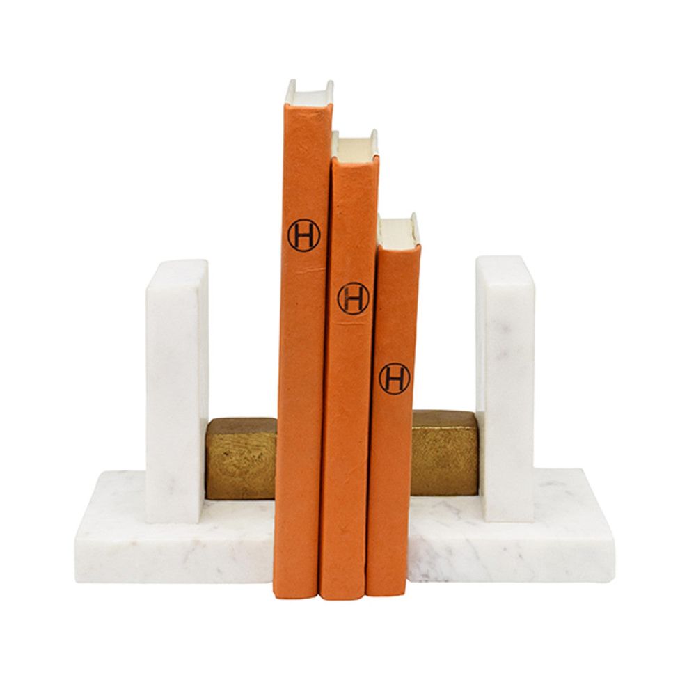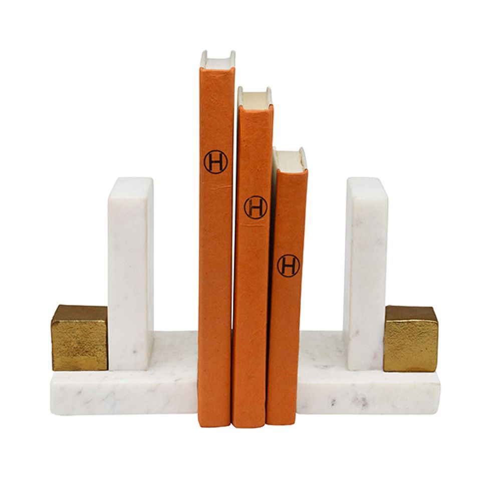 Description: PAIR OF WHITE MARBLE BOOKENDS WITH BRASS SQUARE DETAIL *Marble is a natural stone and will vary slightly in color, pattern, and veining.