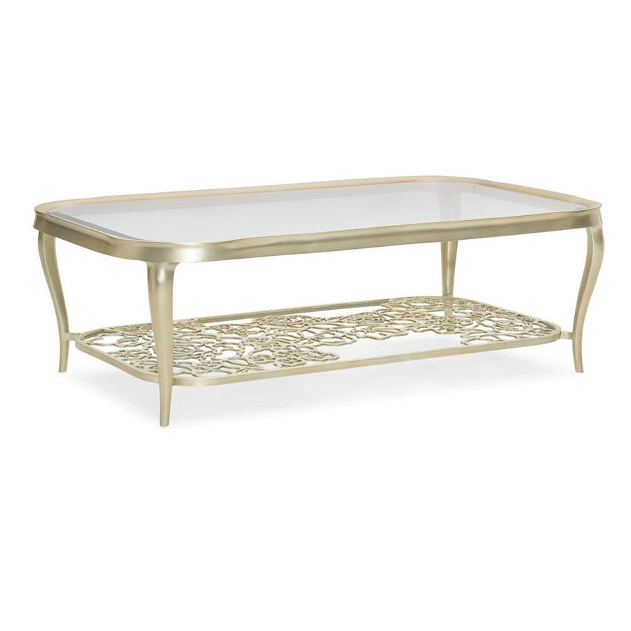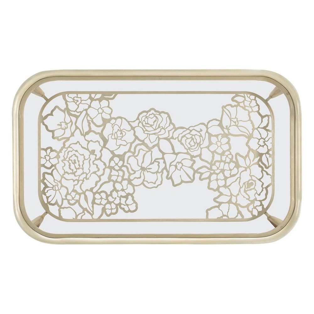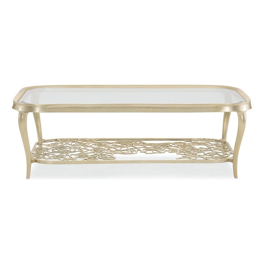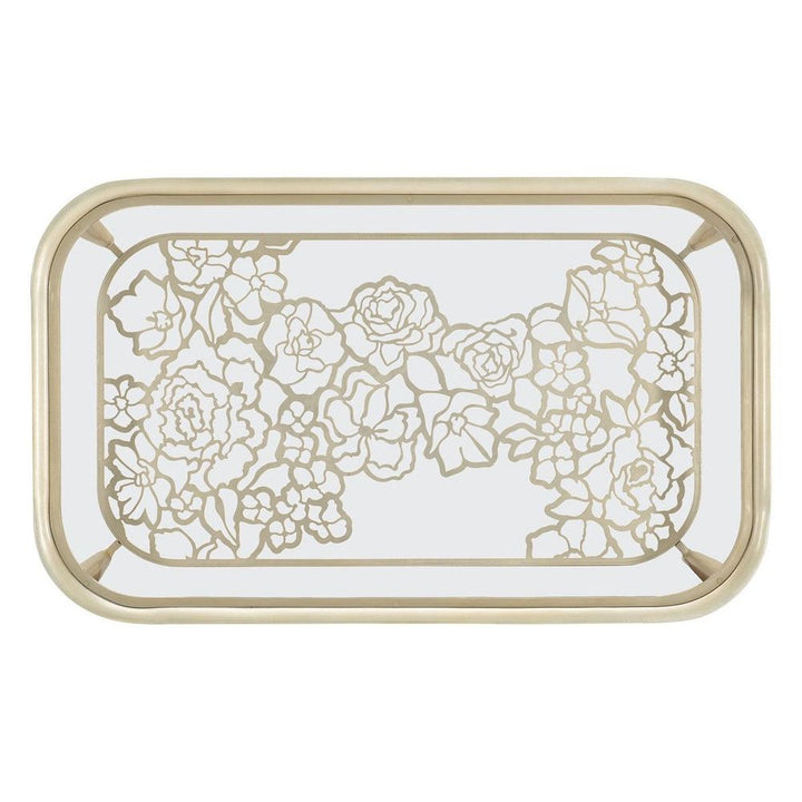 Defined by its distinctiveness, this cocktail table is in full bloom. A rounded rectangular metal frame encloses a tempered-glass top with elegant bevel. Look below and see the beauty of a metal stretcher crafted of cutout flowers arranged in a geometric pattern forming a virtual garden. Graceful cabriole legs support its open design and are highlighted with an Oracle finish. While traditional at heart, this captivating table is sure to surprise and delight all who see it.