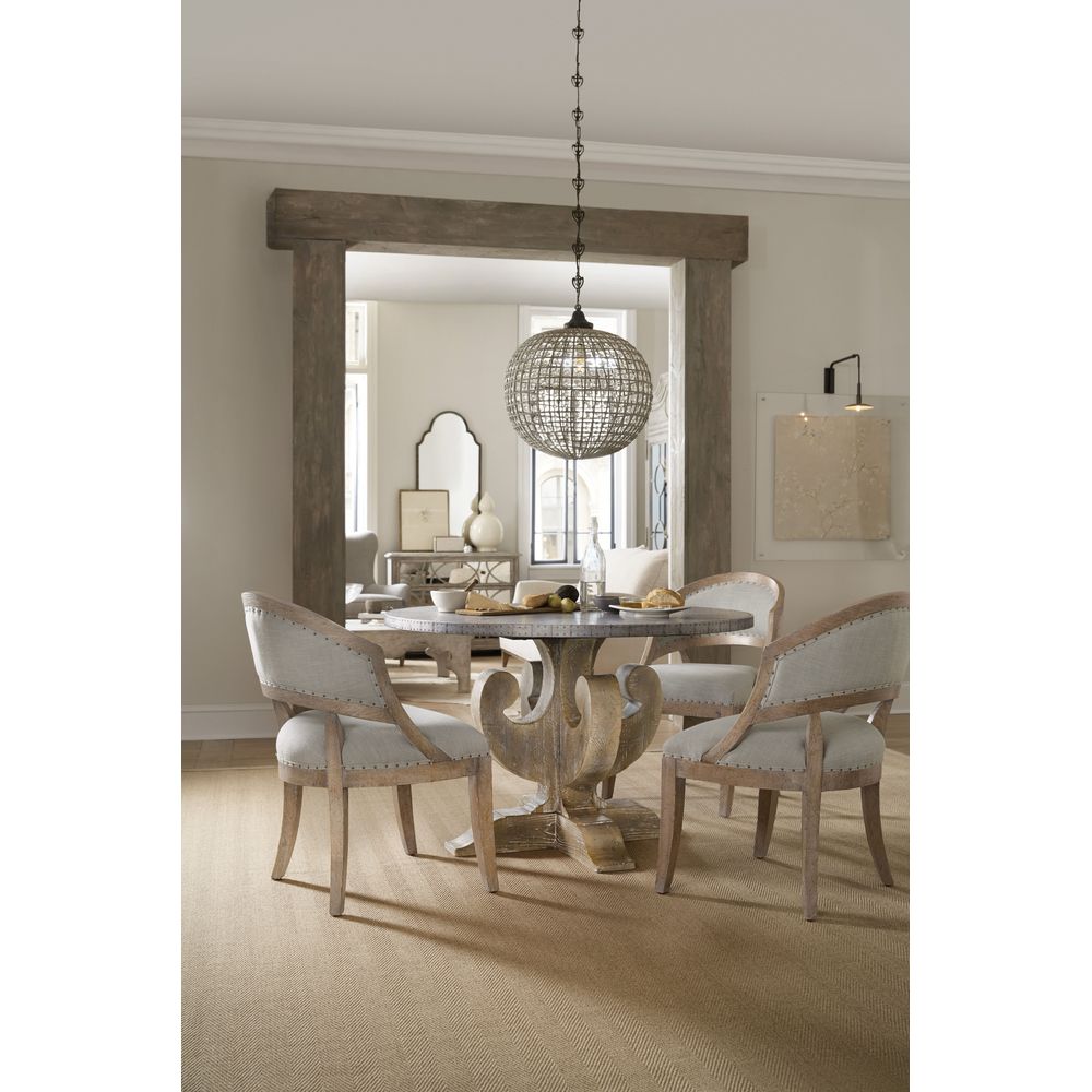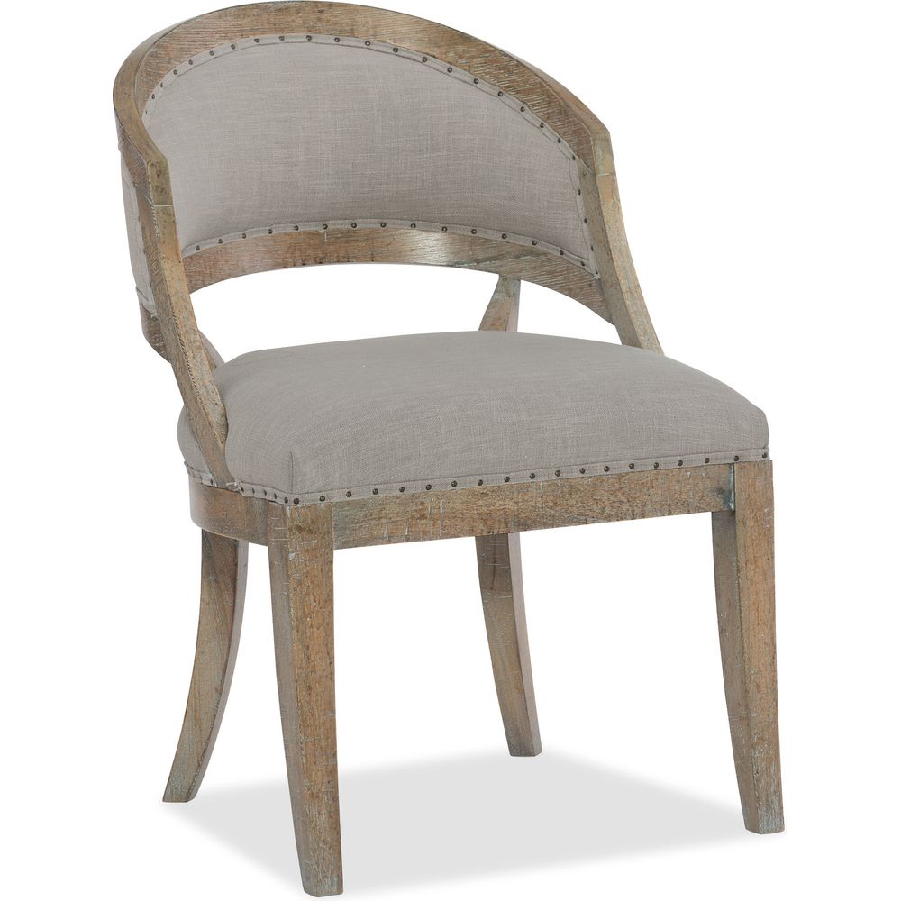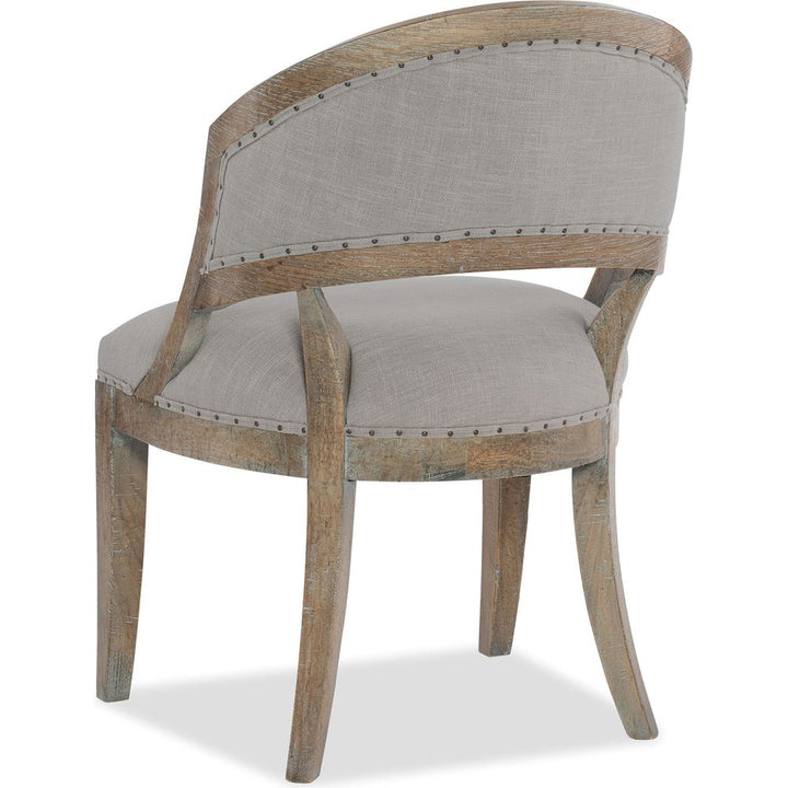Description: This lyrical silhouette offers comforting style with its neutral palette and textural blend, combining a soft gray Antwerp 100% Linen fabric trimmed in gimp welt with tiny nailheads, with an Antique Milk Paint finish. The nearly opaque milk-colored paint is applied over light brown for a brushstroke effect, filled with character.