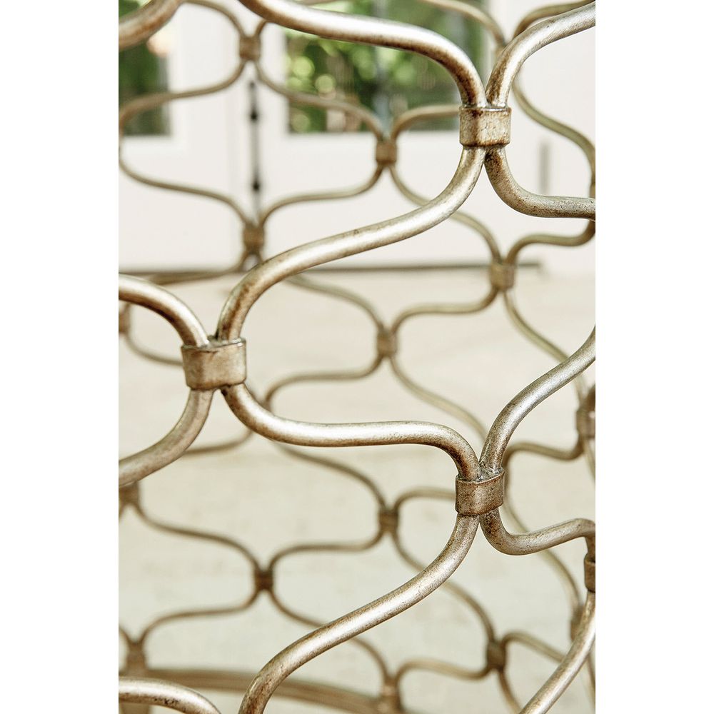 Feature 1: The decorative metal base takes its cue from fashion and the popular cuff bracelets, even the hand-burnished silver leaf finish is appreciated for its handsome detail. The 72 inch diameter glass top is three quarters of an inch thick with a one-inch beveled edge.