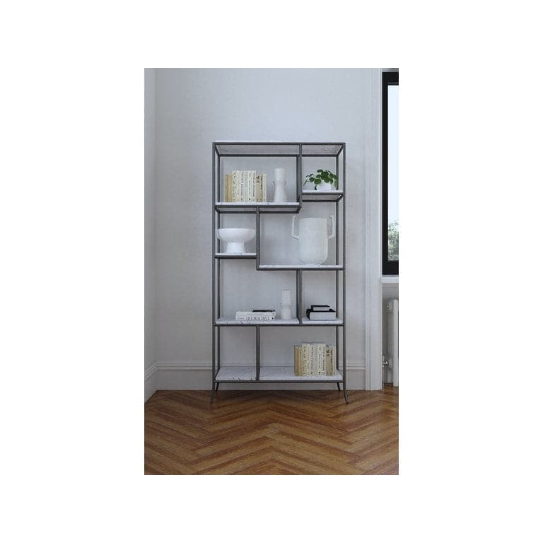 - Finish:Blues,Dark gray textured metal frame with Blue Forest stone shelves