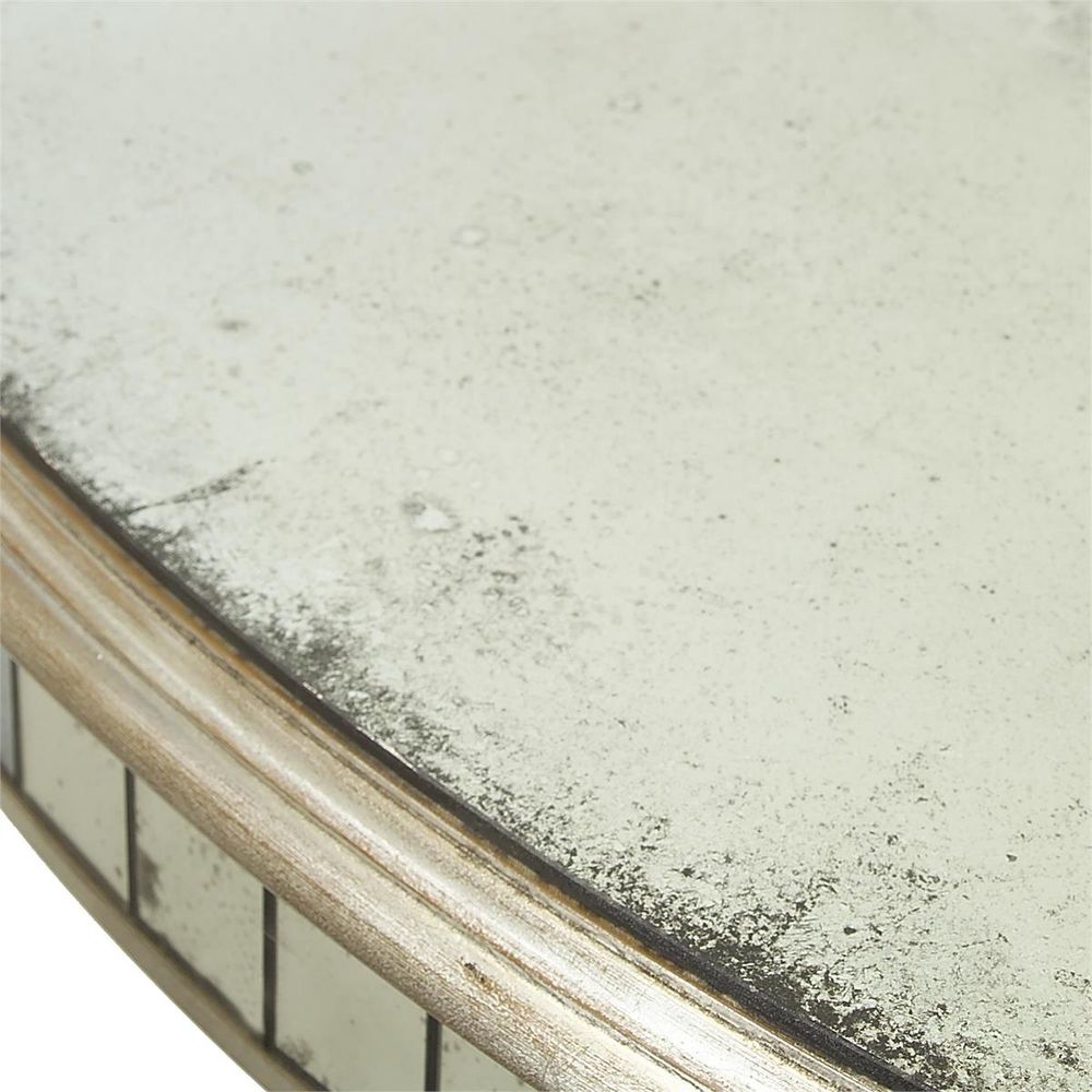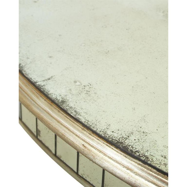 Description: The turned, bulbous column and edge details are finished in Parisian silver, while the apron rail is inset with antiqued mirror tiles, above which there is a foxed mirror top.