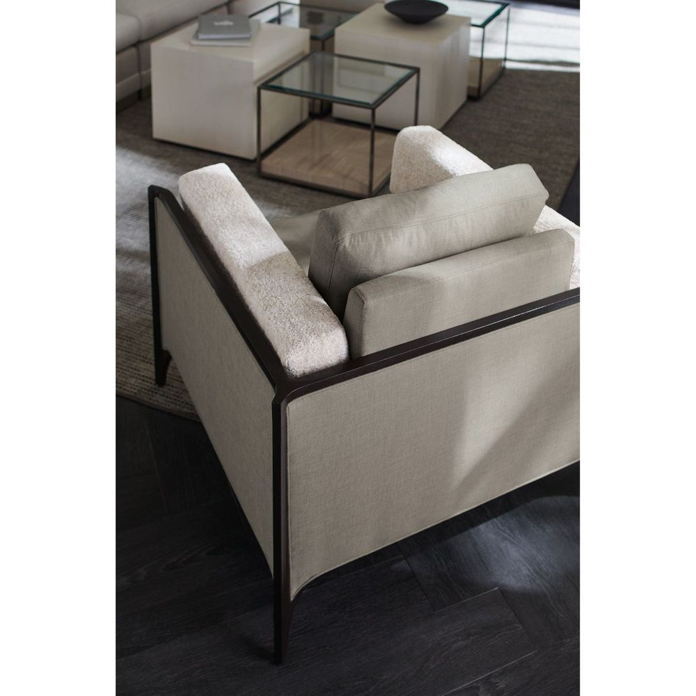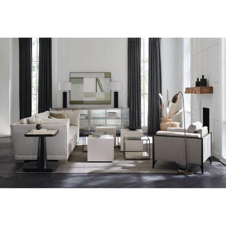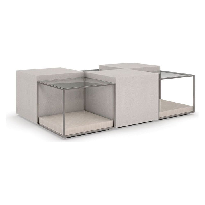 Bunched or single, this architectural design lets you create an ever-changing cocktail table that's open to interpretation. Framed in Deep Bronze metal, a butcher block shelf in a pearlescent Moonstone finish illuminates the linear grain of Koto veneers. Topped in glass with a beveled edge, it's visually light, with an elevated, casual style. Pair with our Solid Ground cocktail table, wrapped in faux shagreen, to create a multi-dimensional, layered collection with luxe appeal.