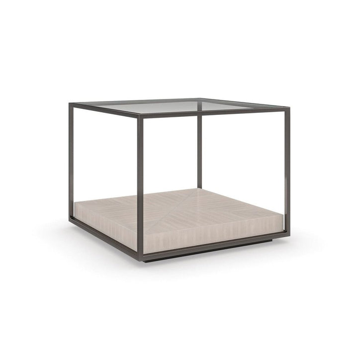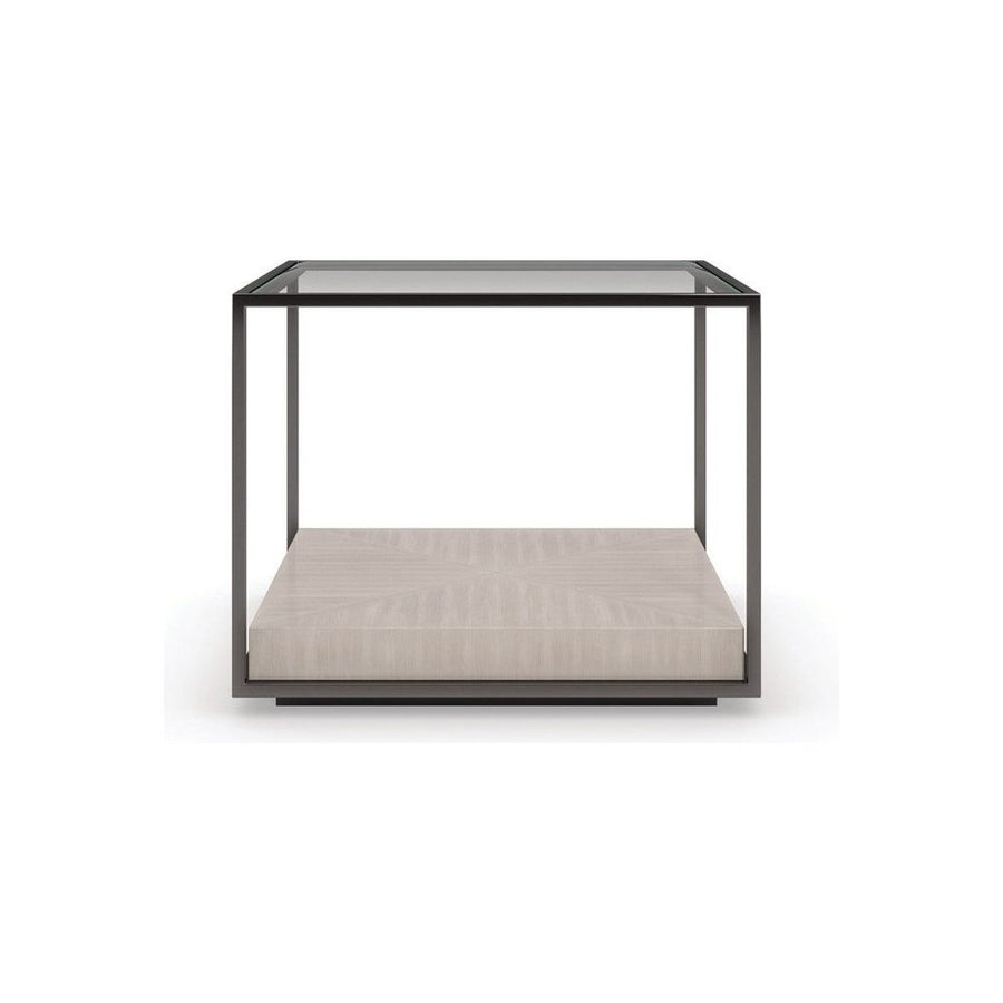 Features: Glass top with 3/4 bevel.Metal frame in Deep Bronze.Shelf in Moonstone.Plinth base in Almost Black.