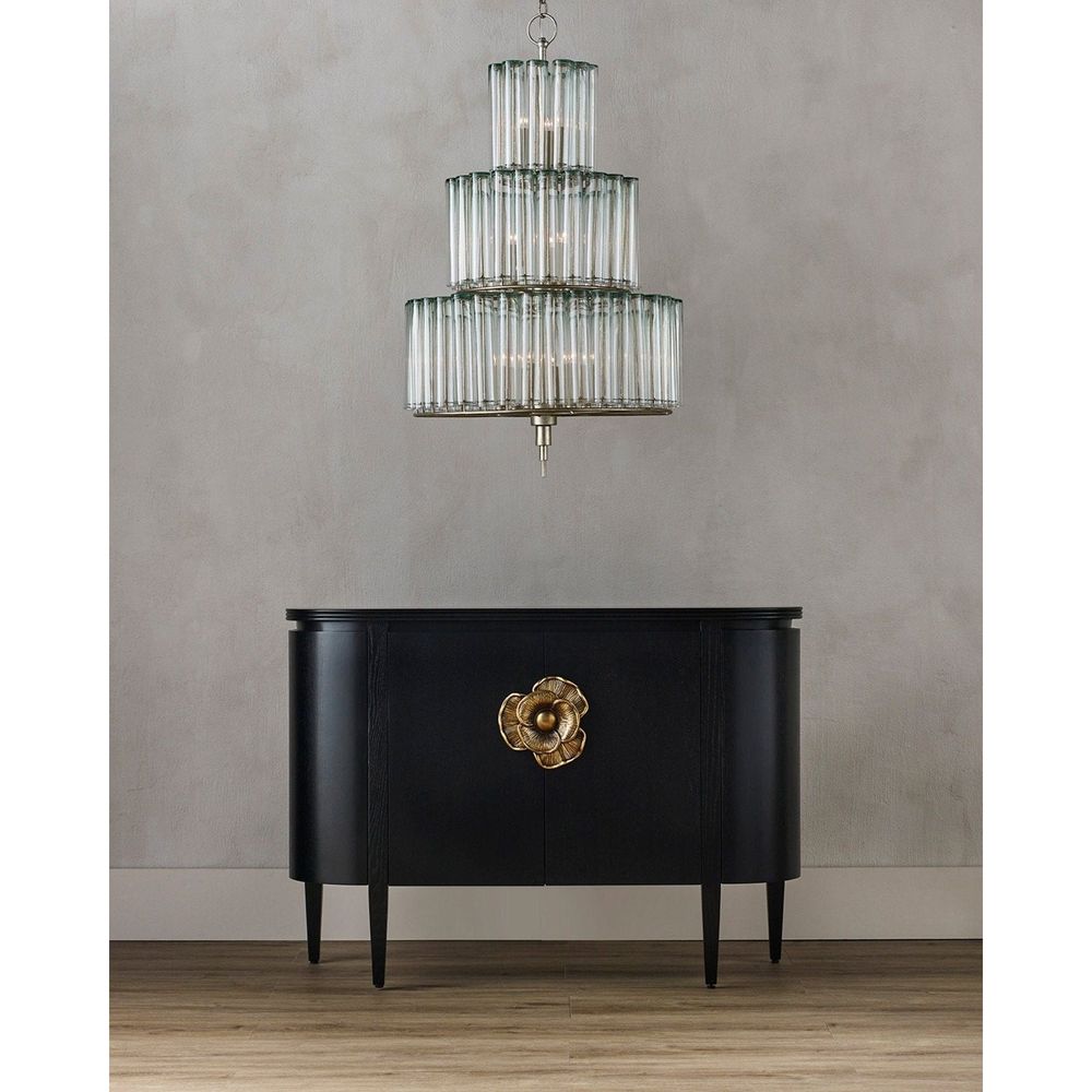 Description: The impressively sized brass flower pull on the Briallen Black Demi-Lune Cabinet is a stunning ornamentation. Contrasting the Caviar black stain, the floral motif in an antique brass finish brings the black cabinet a sophisticated feel and illustrates the skill of our artisans who hand-cast the handle in brass.