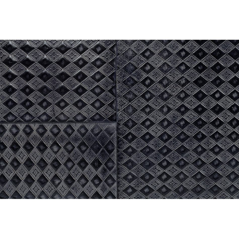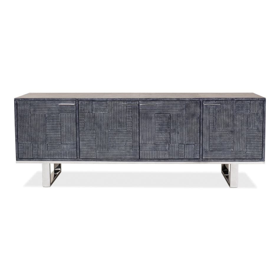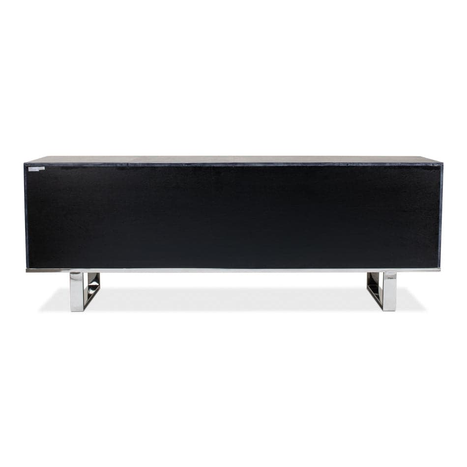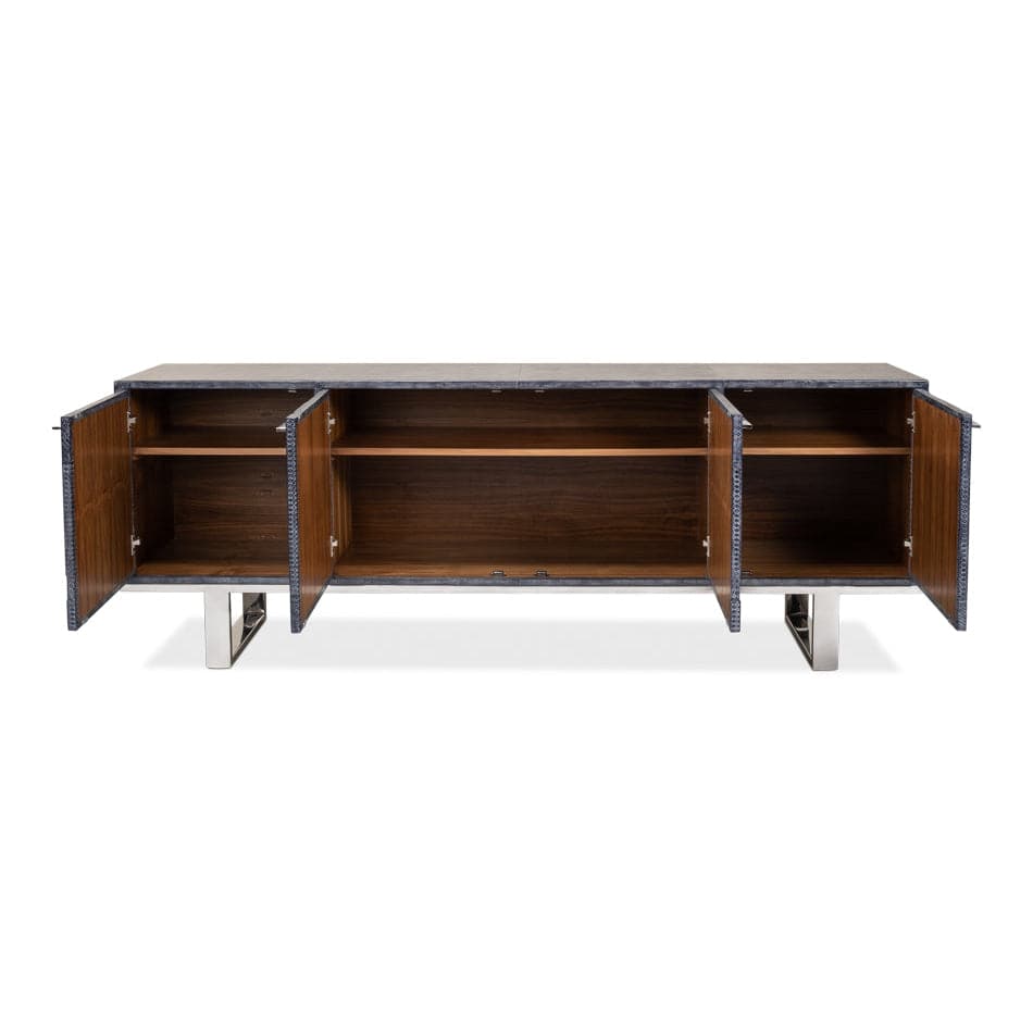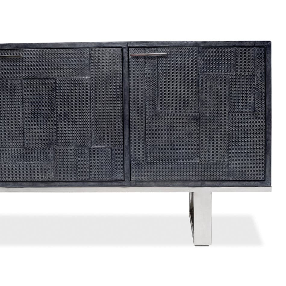The doors of this leather covered credenza have slightly raised panels with overall diamond pattern. Base is iron with stainless finish. Door handles are stainless steel. Interior is all natural wood finish.